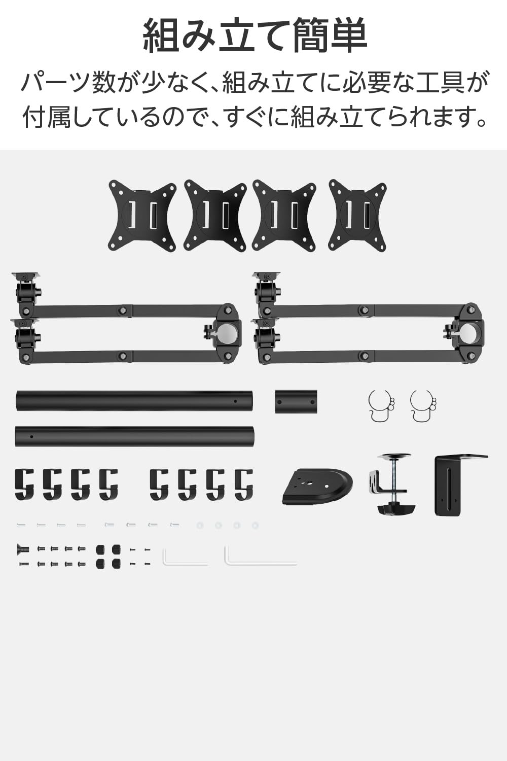 * 4画面対応モニターアーム、前後移動ができる4軸タイプ、マルチモニターに最適な水平可動方式。縦2画面×横2画面 17~32インチ対応、耐荷重各~9kg(合計36kg)