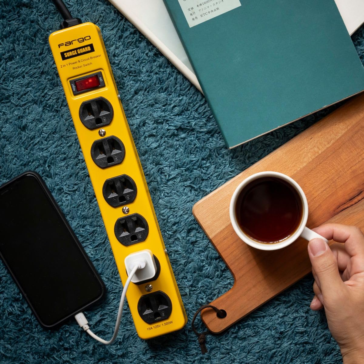 Fargo STEEL TAP 電源タップ スチール製 3ピン対応 アース線付き コード 壁掛け 固定 (イエロー, 6個口2m)