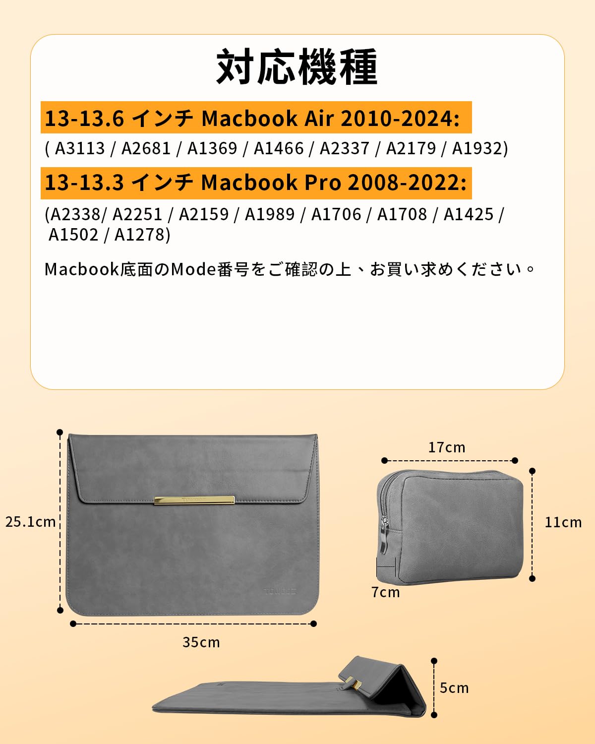 * 【対応機種】市販された13インチから14インチのパソコンに対応可能。13-13.6 インチ Macbook Air 2010-2024 M1 / M2 /M3 チップス: (A3113 / A2681 / A1369 / A1466 / A2337 / A2179 / A1932); @13-14インチ Macbook Pro 2008-2024 M1/ M2/ M3チップス: (A2159 / A1989 / A1425 / A1502 / A1278 / A1706 / A1708 / A2251 / A2338 / A2442/ A2918 / A2992 / A2779) Macbook底面のMode番号をご確認の上お買い求めください。️ご注意:本製品は薄型のため、透明なプラスチックケースとの併用には適しません。