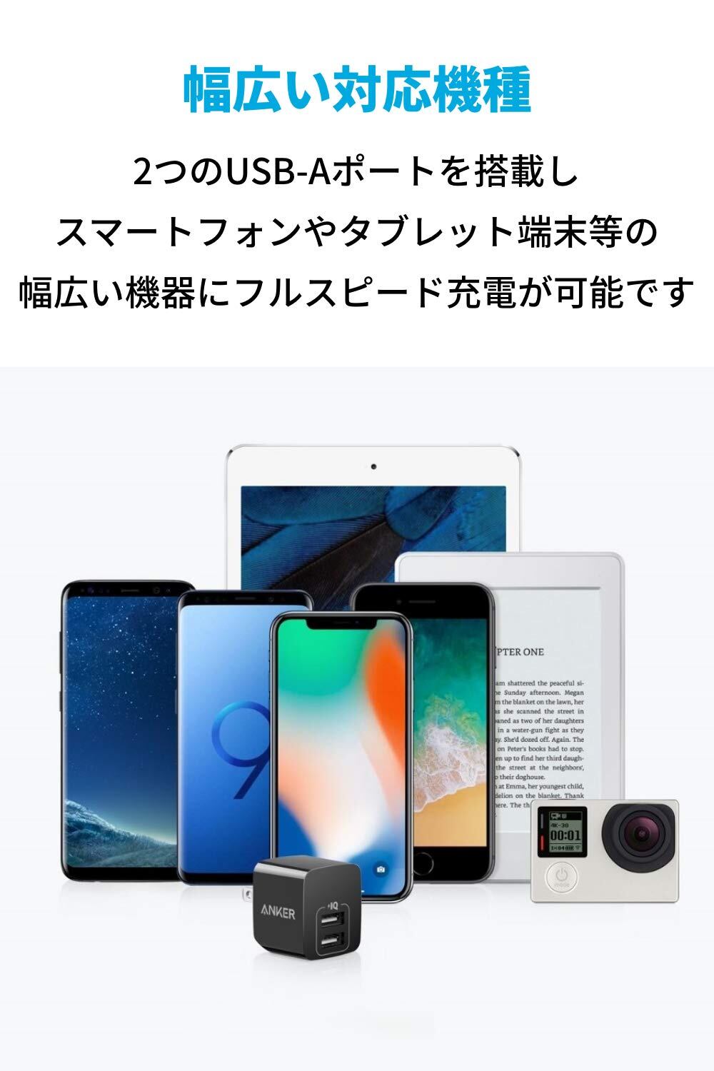 * フルスピード充電技術:Anker独自のPowerIQにより、フルスピード充電が可能です(タブレット端末等、2A以上の入力に対応する機器を2台同時に充電する場合、充電速度が遅くなる場合があるため、「Anker PowerPort 2 Elite」をご利用ください)。