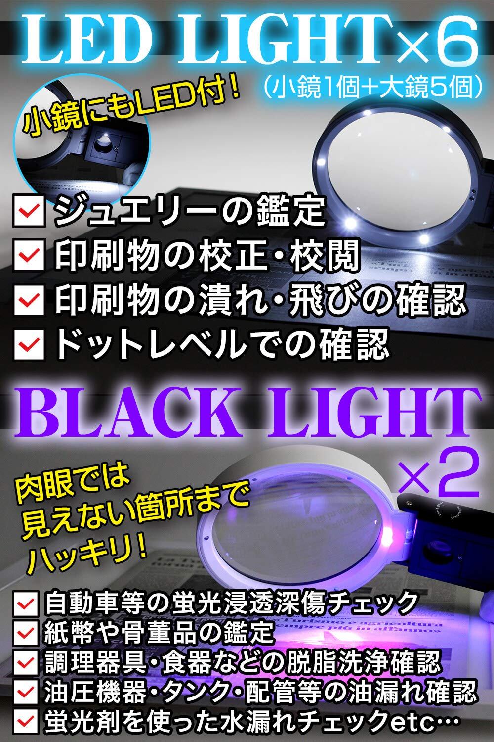 * * 【ブラックライト搭載】ブラックライトで、自動車の蛍光浸透傷のチェック、紙幣・骨董の鑑定、調理器具の脱脂洗浄チェック、油圧機器の油漏れチェックなどに使えます。