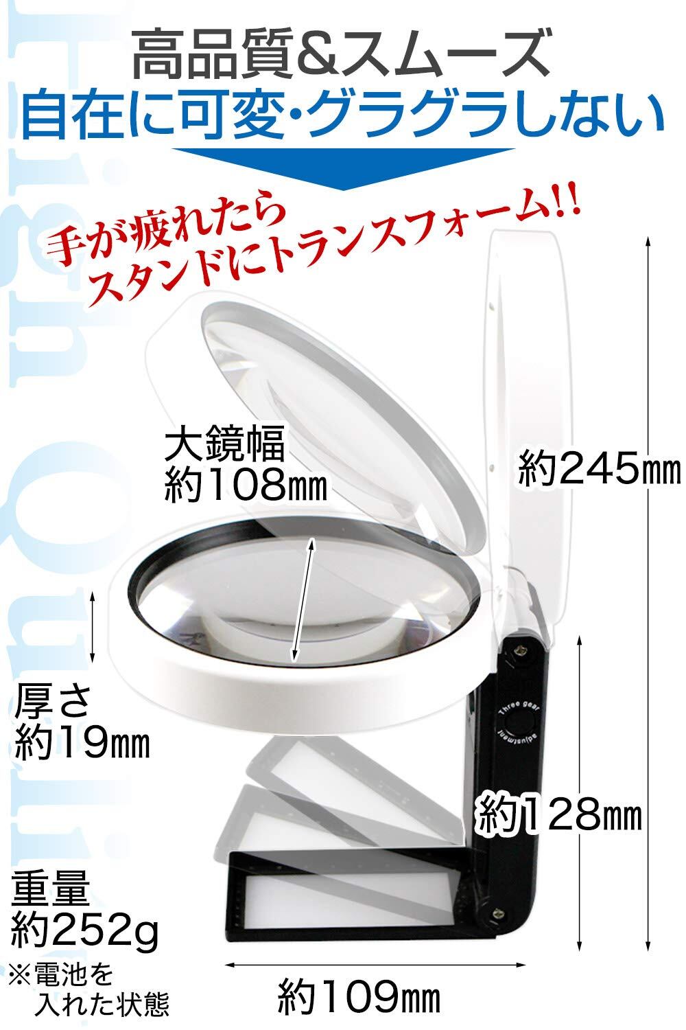 * * 【サイズ】大鏡:幅108mm×厚み19mm×全長245mm【素材】プラスチック・アクリル光学レンズ 【重さ】252g(電池込み)【付属品】USBケーブル・安心の45日間保証書 【仕様電池】単4電池3本(別売り)※電池は付いておりません。