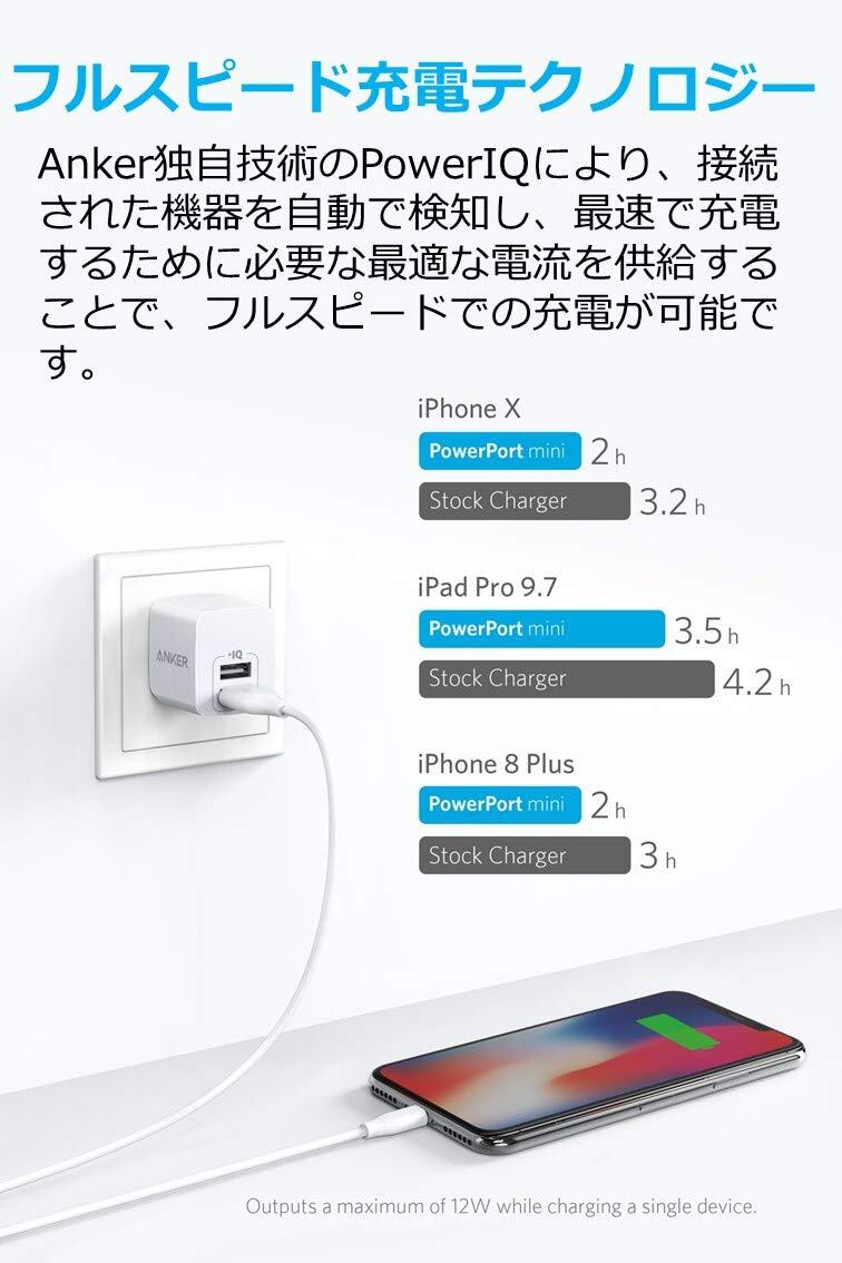 * フルスピード充電技術:Anker独自のPowerIQにより、フルスピード充電が可能です(タブレット等、2A以上の入力に対応する機器を2台同時に充電する場合、充電速度が遅くなる場合があるため、「Anker 24W 2ポート USBフルスピード充電器」をご利用ください)。