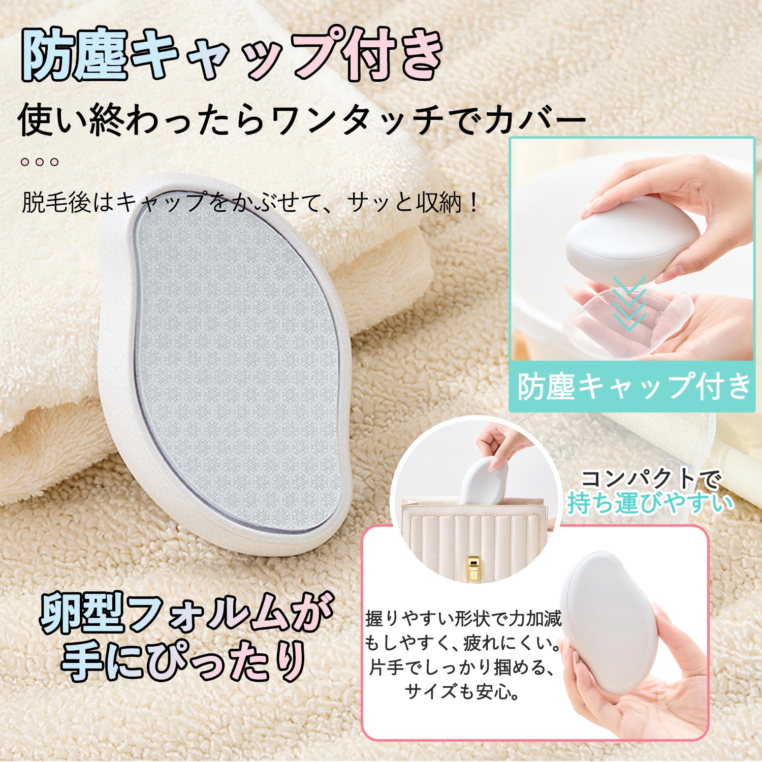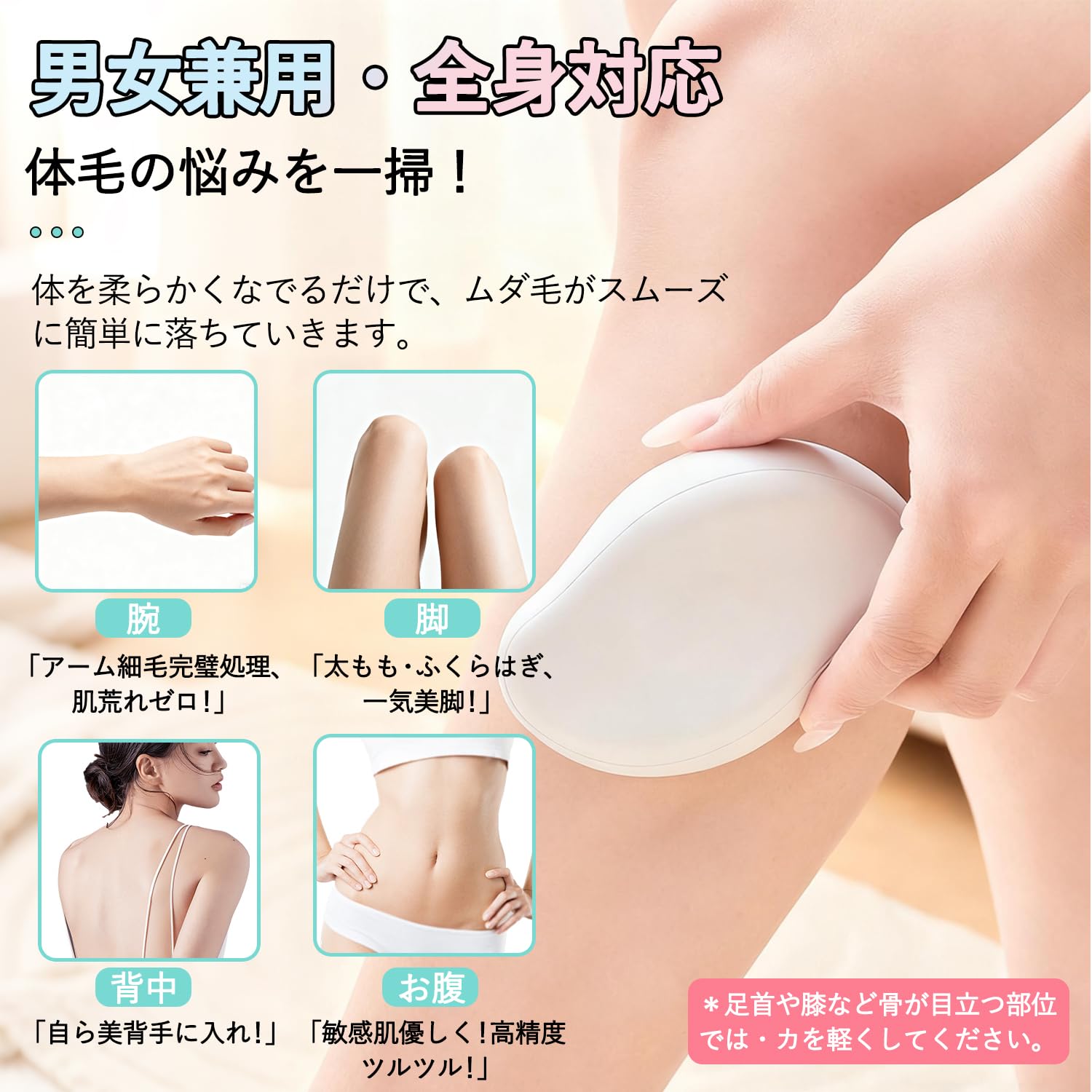 * 【角質ケア×美肌効果・2WAYスキンケア設計】微細なガラス加工面により、ムダ毛ケアと同時に肌表面の古い角質をやさしくケア。 肌のざらつきを抑え、なめらかな触り心地へ。 太もも・ひじ・お腹・背中など、気になる部位に使用可能。※強くこすらず、軽い力でご使用ください。