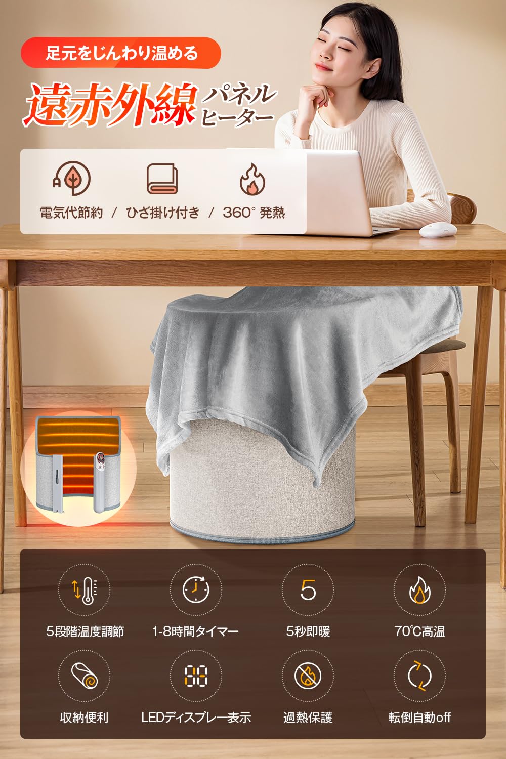 パネルヒーター デスクヒーター 足元 【2025冬革新版&360°発熱& LCDディスプレー表示】 ペット 遠赤外線パネルヒーター デスク下 冷え対策 5段階温度調節 1-8時間タイマー設定 過熱保護 転倒自動 省エネ 暖房器具 高温 足元ヒーター 折り畳み式 テレワーク オフィス 年寄り ひざ掛け付き