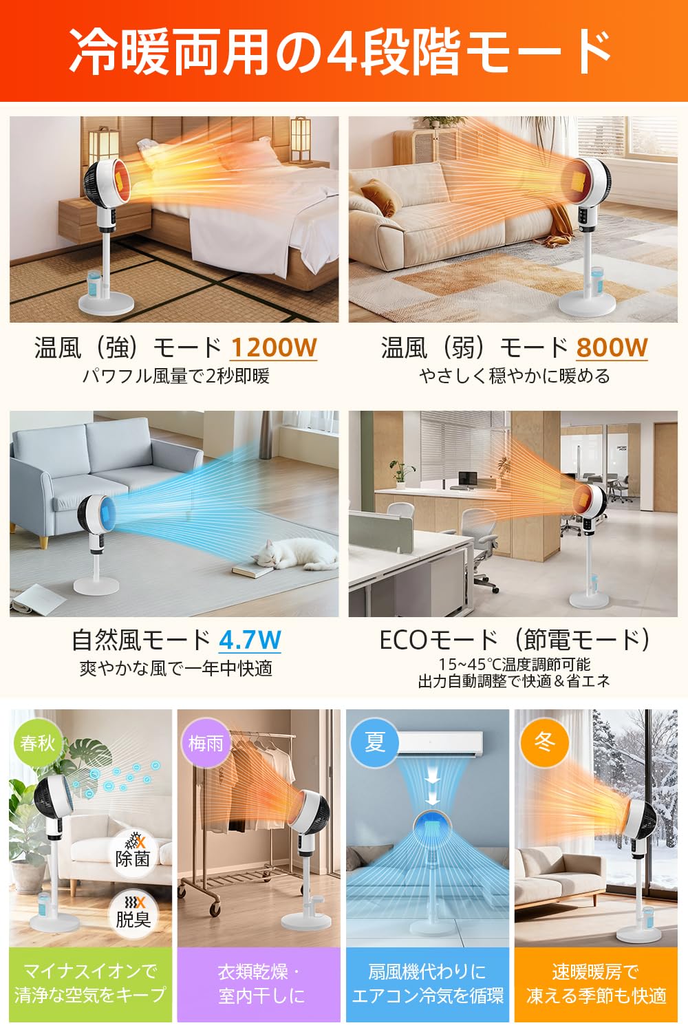 * 【冷暖4モード搭載、15~45℃温度調節&出力自動調整可能】本製品は冷暖両用の4段階モードを搭載しており、季節や好みに応じた柔軟な使い方が可能です。自然風モード(4.7W)はやわらかな送風で自然のそよ風のような涼しさを再現し、春夏の使用にも最適です。温風(弱)モード(800W)は控えめな出力でじんわりと暖め、長時間使用しても心地よさが続きます。温風(強)モード(1200W)はパワフルな風量で素早く部屋を暖め、厳しい寒さを即座に和らげます。さらにECO(節電)モードは初期設定35℃から15~45℃の範囲で1℃単位の細やかな温度調節が可能です。設定温度に応じてモードが自動で切り替わり、室温との差が+1℃以内なら自然風、+2~3℃なら温風(弱)、+4℃以上になると温風(強)で運転し、快適さと節電を両立する賢いモードです。