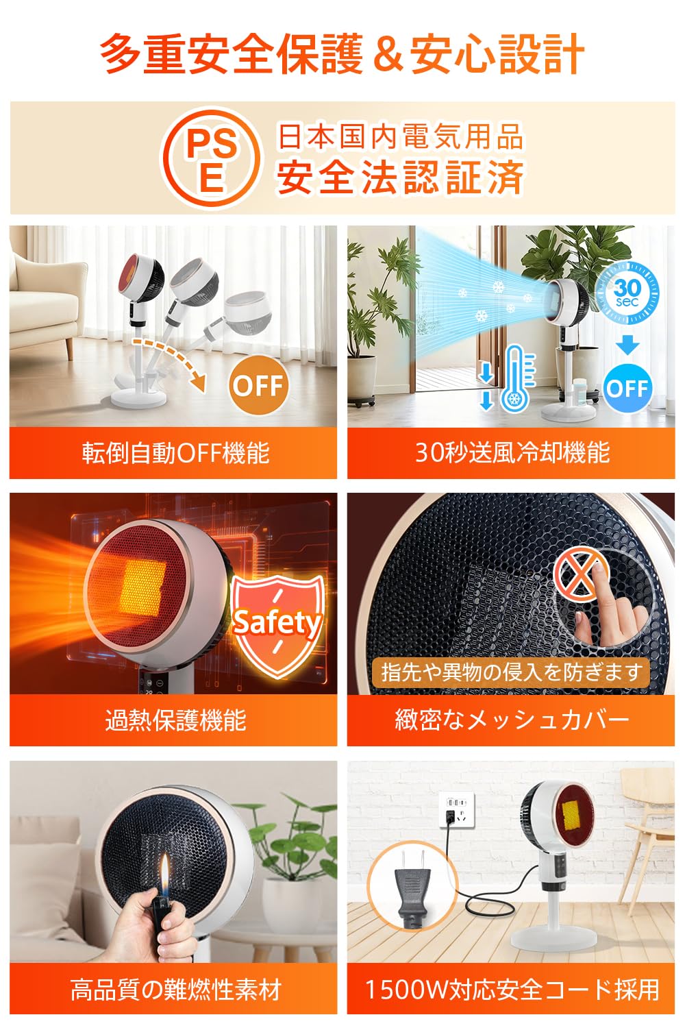 * 【多重安全機能搭載で安心して使える設計】本体内部の温度が90℃を超えると自動で過熱保護機能が作動し、運転を停止し、火災や故障を未然に防ぎます。また、転倒時や40℃以上の傾きを検知すると30秒後に自動で運転を停止し、安全性を確保します。温風運転後に電源を切った際には自然風に自動切替し、30秒間の送風冷却を行うことで火傷や発火を防止します。送風口には緻密なメッシュカバーを採用し、指先や異物の侵入を防ぎます。カバーは耐熱性に優れているため、高温でも変形や劣化の心配がありません。さらに本体は高品質の難燃性素材を採用し、長時間使用しても異臭や焦げ臭がせず、火事や火傷のリスクを抑えます。1500W対応電源コードを採用し、最大出力1200Wでも余裕を持って対応します。長時間の連続運転でも発熱や劣化を抑え、安定した通電を保ちます。電気用品安全法に基づくPSE認証取得済みで、安全性を徹底的に保証した製品です。