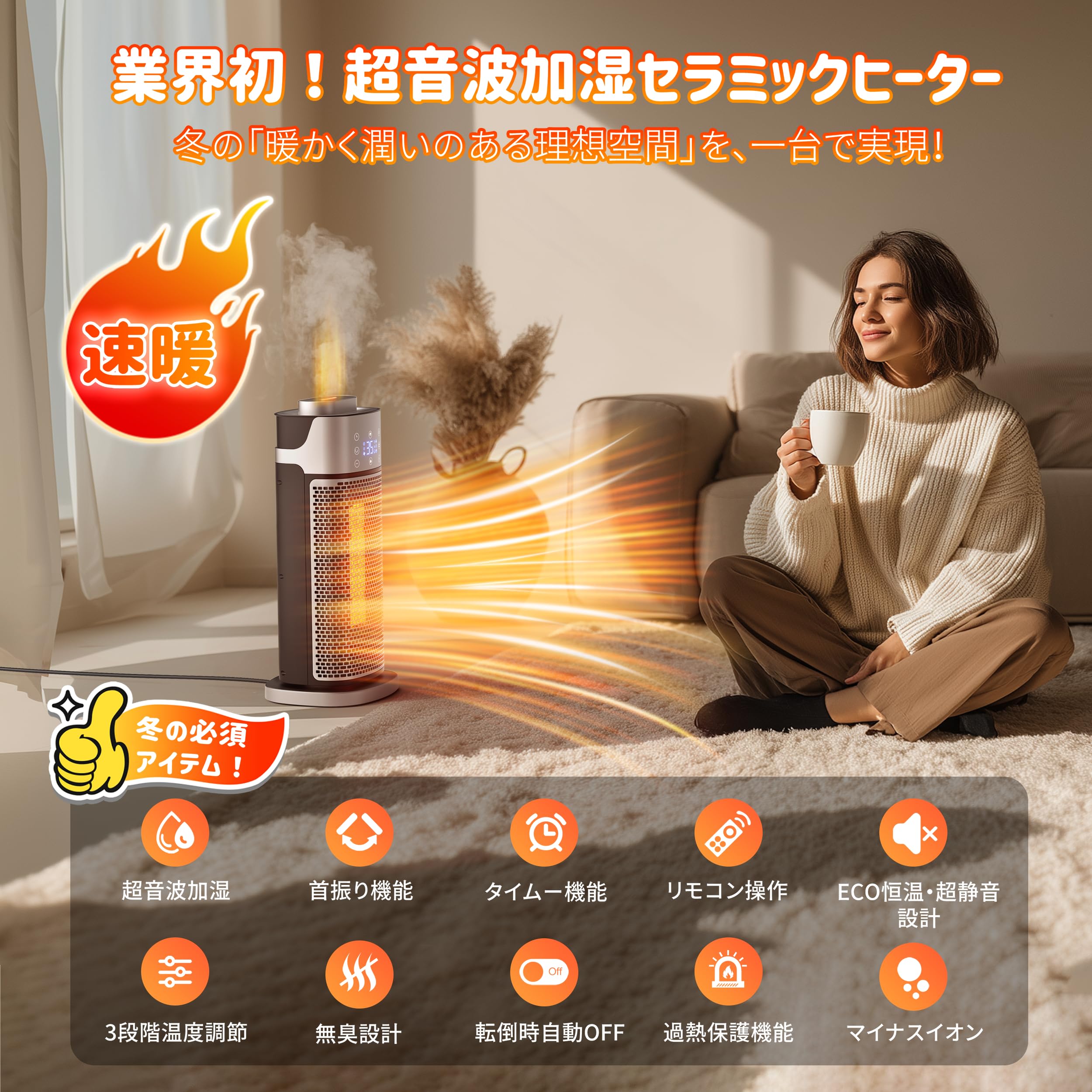 * 【超音波加湿セラミックヒーター】「暖房で空気が乾く」ジレンマを、この一台で解決。「温風+超音波加湿」の一体設計により、パワフルな暖房とともに細やかなミストがお部屋全体に行き渡り、肌や喉の乾燥を防ぎます。490mlの大容量タンクで一日中潤いを持続。さらに、マイナスイオンがほこりや生活臭を抑制し、暖かく清々しい室内環境を実現します。 時代が求めた革新的ヒーターで、乾燥知らずの快適な冬をお過ごしください。