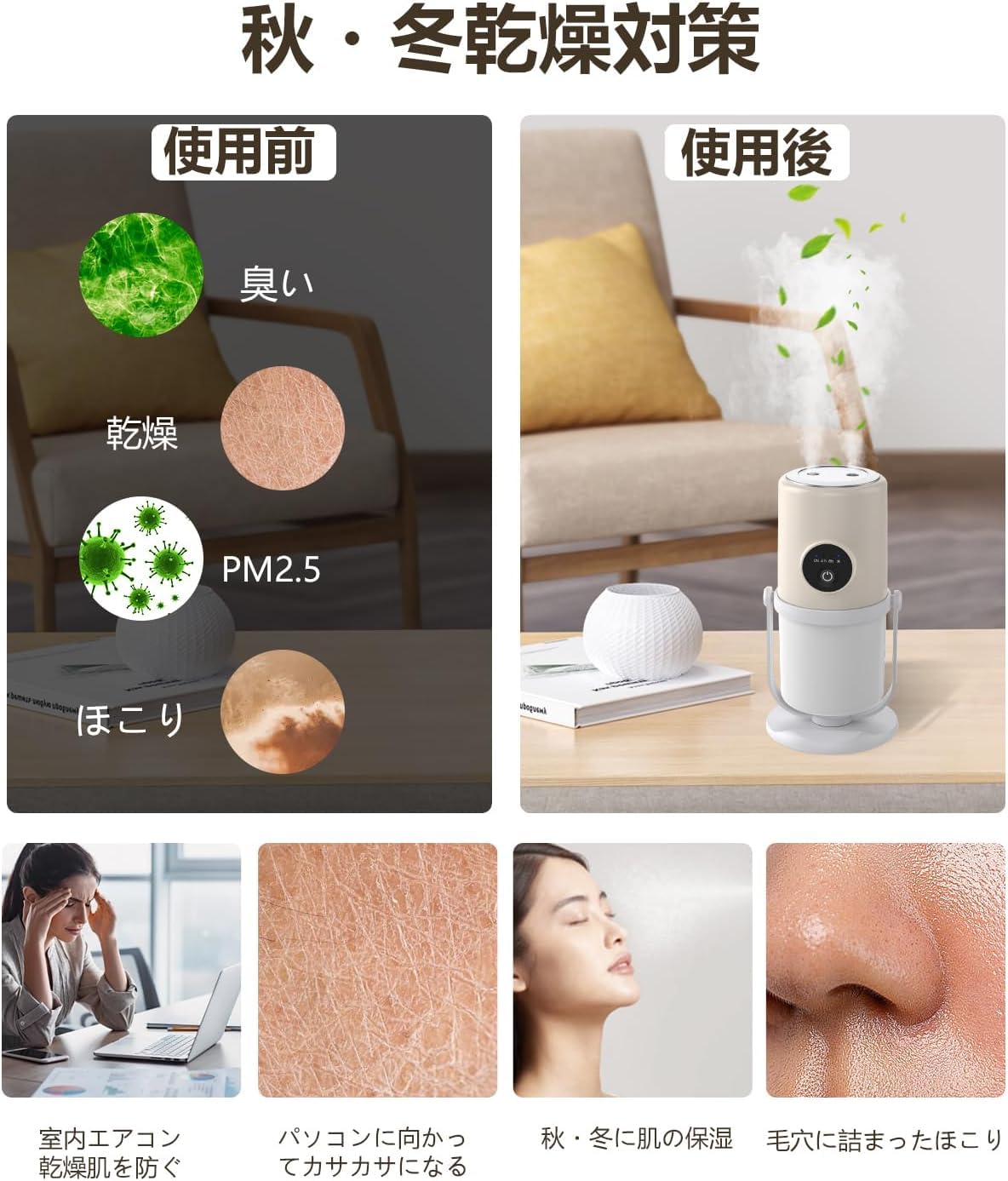 * 【2025発売新モデル加湿器&自由な角度調整可能】乾燥対策の新常識!革新的な450°自由角度調整機能を搭載した加湿器 小型が登場!上下90°・水平方向360°まで自由にミストの向きを調整できるので、デスク全体・お部屋全体をムラなく加湿。お好みの角度でピンポイント加湿もOK!ミストの方向を自由に変えられるから、顔や喉への直接加湿、またはデスク周りや寝室の空間加湿など、シーンに合わせて快適にご使用いただけます。乾燥が気になる季節も、心地よい湿度をキープして肌・喉の不快感を和らげます。高耐久設計・鉄製スタンド採用 :スタンドには高品質な鉄製素材を使用。一般的なプラスチック製スタンドに比べて約15倍の耐久性を実現!さらに3万回の耐衝撃テスト合格で、落下にも強く壊れにくい設計。長く安心してお使いいただけます。