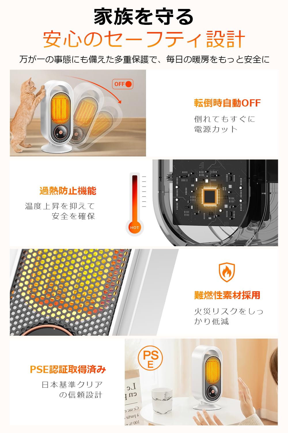 * 【シンプルな見た目に、確かな安全機能を凝縮】電気ファンヒーターは、暖かさを提供するだけでなく、安全性にも徹底的に配慮しています。本体には転倒時自動電源オフ機能と過熱保護システムを搭載。万が一傾いたり倒れたりしても瞬時に電源が切れ、事故を未然に防ぎます。内部温度が異常に上昇した際にも自動で加熱を停止し、安全を確保します。外装には耐熱性の高いABS難燃素材を採用し、高温でも変形しにくく優れた耐燃性能を発揮。日本のPSE認証を取得しており、安全基準にも適合しています。ペットのいるご家庭でも安心してお使いいただけます。