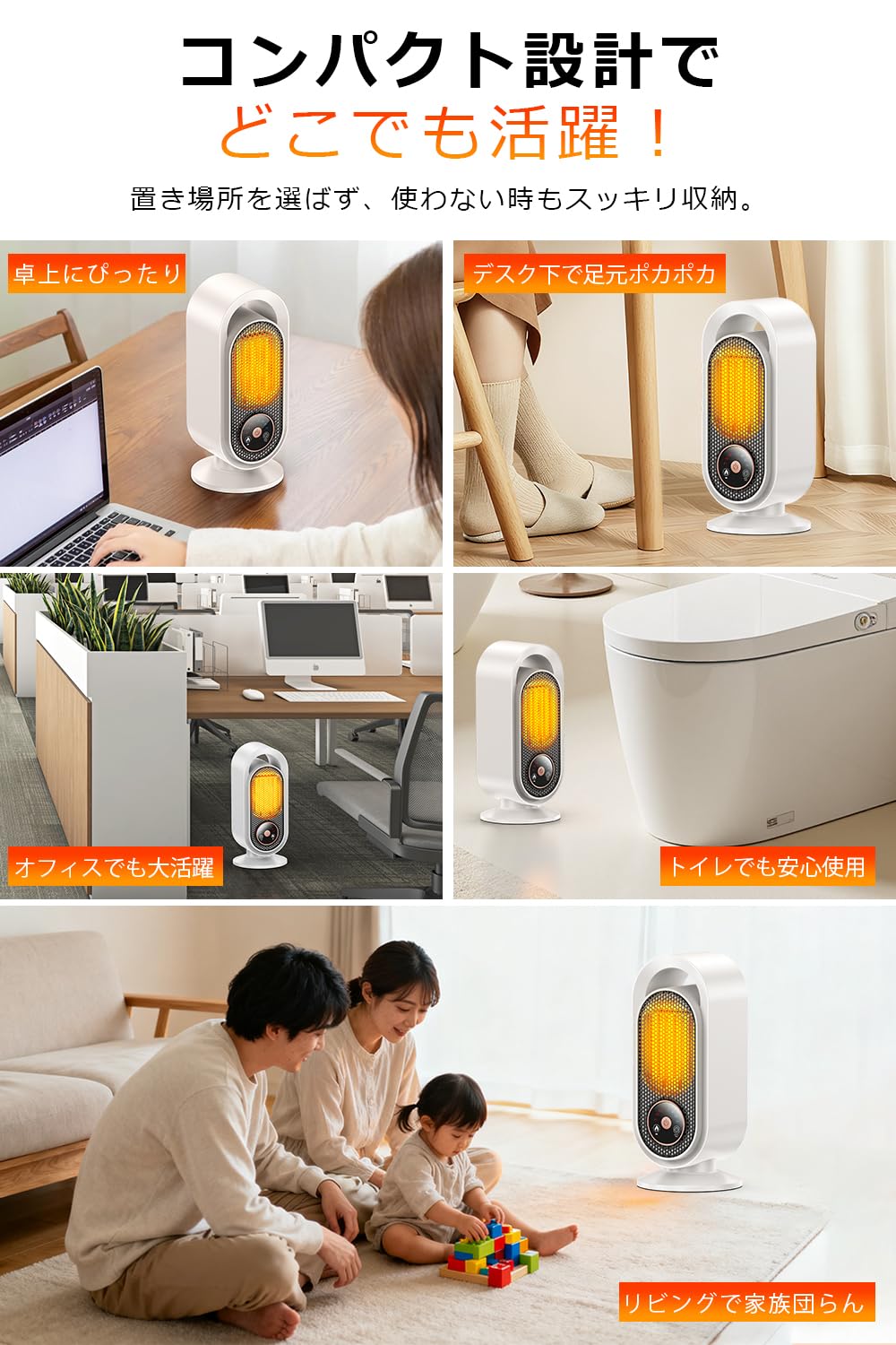 * 【わずか2秒でぽかぽか!瞬間暖房で冬を快適に】高効率PTCを搭載したセラミックヒーター、わずか2秒で暖かい風を送り出します。寒い朝でもすぐに冷えを和らげ、心地よい温もりを実感できます。600W/900W/1200Wの3段階温度に対応し、600Wは省エネで穏やかな暖かさを提供し、パーソナルスペースに最適。900Wはバランスの取れた暖房で、デスク周りやベッドサイドをしっかり暖めます。1200Wはパワフルな熱風で、お部屋全体をすばやく温めます。使用シーンや部屋の広さに合わせて自由に調整でき、寝室や書斎、オフィスなど、あらゆる場所で快適な暖かさを保ちます。