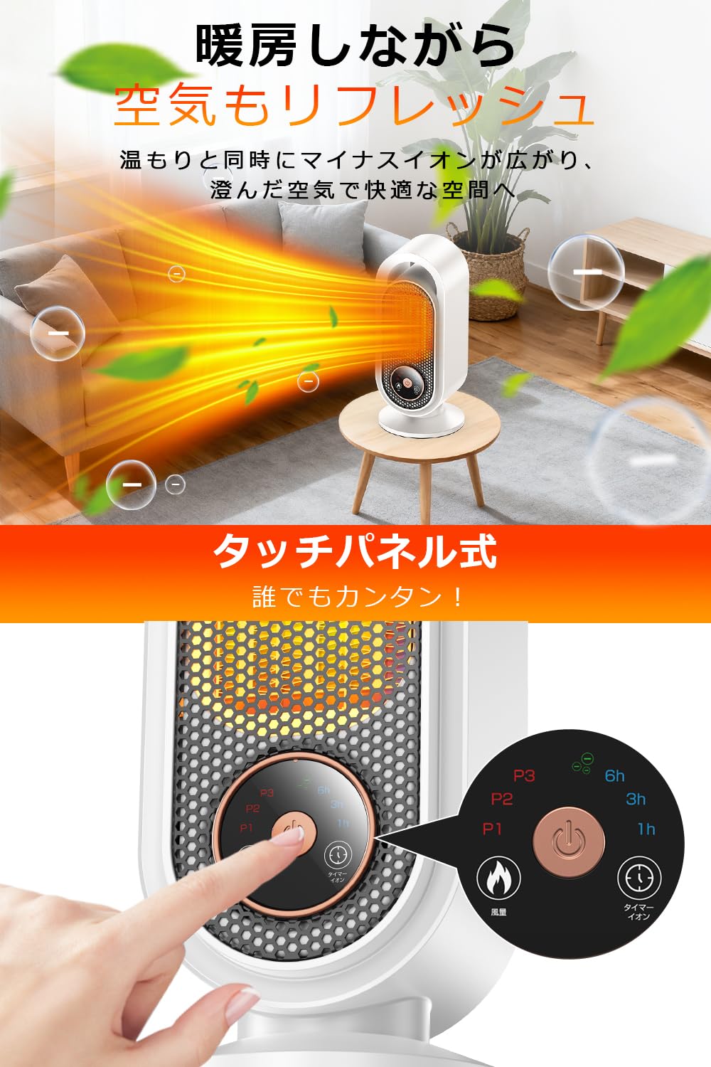 * 【暖房+空気清浄のW機能搭載。簡単タッチ操作】本製品は、暖房と空気清浄の機能を兼ね備え、より健康的で快適な暖かさをお届けします。内蔵のマイナスイオン発生器により、温風を送りながら高濃度のマイナスイオンを放出し、空気中のホコリやニオイを効果的に除去。清潔で自然な室内空気を保ちます。操作面にはシンプルなタッチパネルを採用し、軽く触れるだけで電源や温度、モードの切り替えが可能。反応が早く、視認性も高いため、複雑な設定は不要です。オフィス、寝室、リビングなど、どんな場所でも理想的な温度と空気環境を簡単にコントロールできます。