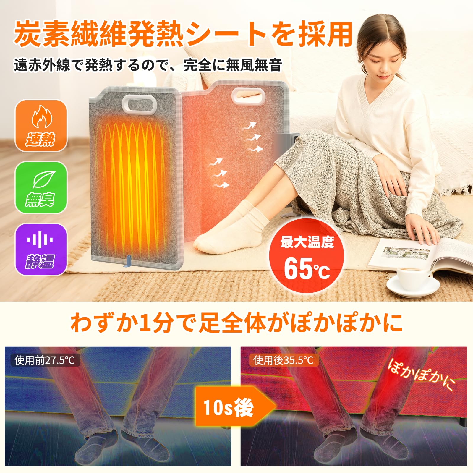 * 【 折りたたみ式ヒーターパネル・収納ラクラク】折り畳み式なので、邪魔にならず、省スペースに収納できます。組み立ても簡単、畳んだ時の厚さただ3cmいつでもサッと使いやすいです。デスクワークのほか、勉強部屋、オフィス、トイレ、更衣室で使用可能です。そして、3つのスタンドが付き、角度を固定でき、転倒防止が可能です。色んな場所で活躍します、猫や犬などにも安心的に使用できます。