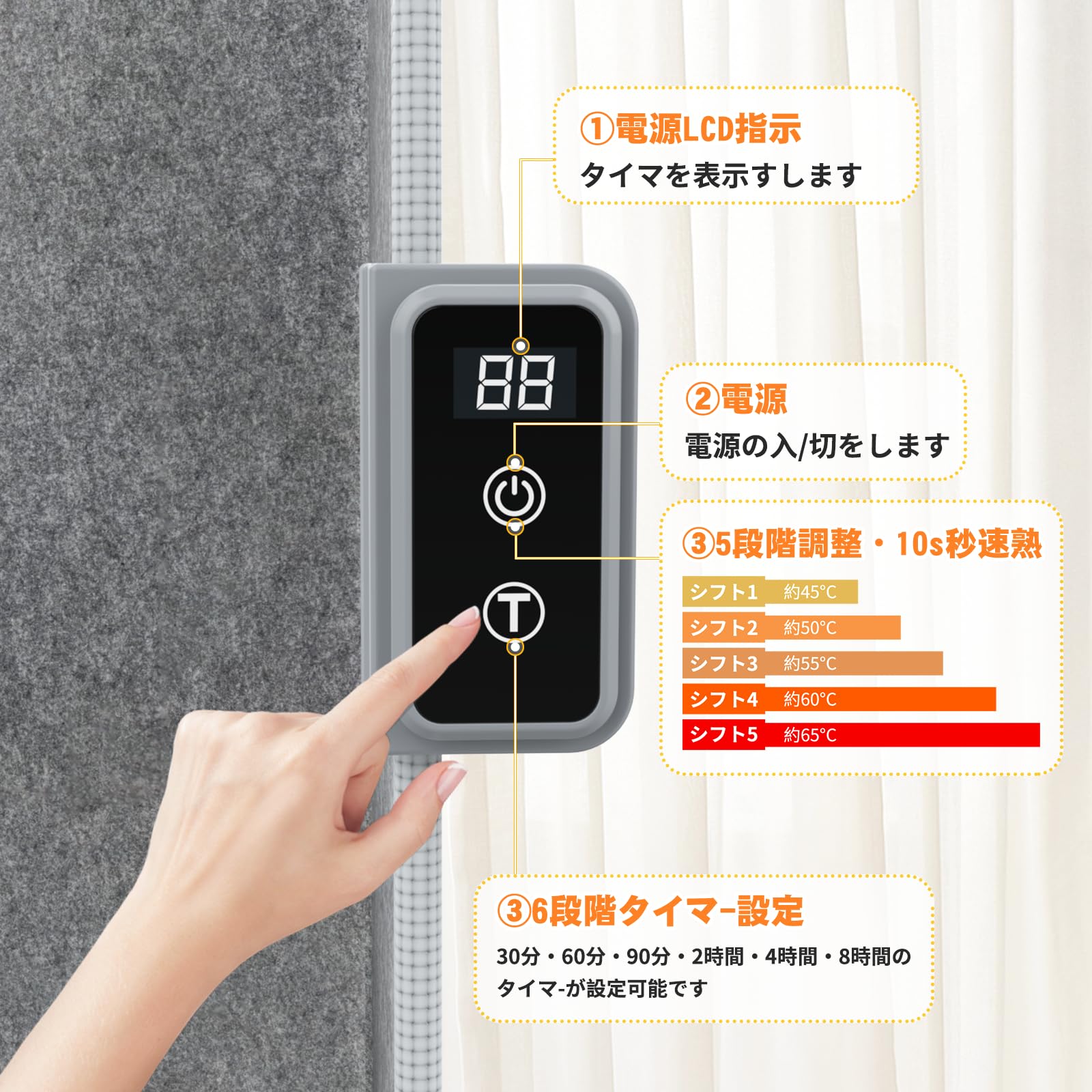 * 【5段階温度設定・タイマー機能付き】2025年新型パネル ヒーターはボタン式で操作しやすく、5段階の温度調整は「強:65±5℃、中強:60±5℃、中:55±5℃、弱:50~45±5℃」をラクラクワンタッチ操作に、コントロールを更にシンプル化。操作ボタンが簡単なので、子供やお年寄りも簡単に使用できます。また、6段階のタイマー機能付きなので、万が一消し忘れた場合でも自動的に電源が切れる便利な機能です。ペット用でも心配ありません。