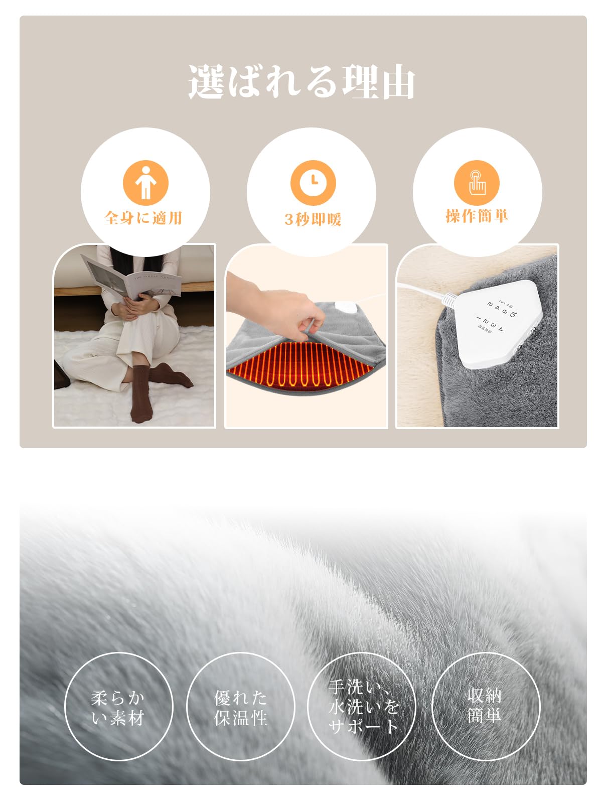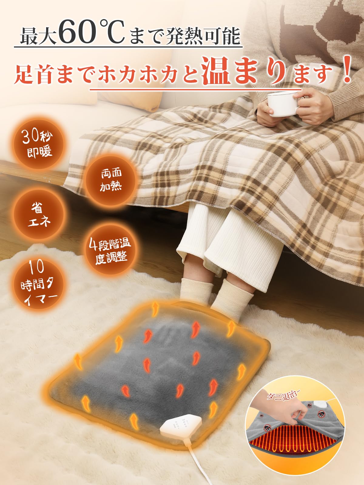 * 【3秒即暖!最大60℃まで発熱可能、デスクワークに最適】電気足温器の魅力は、エアコンやストーブでは暖気が届きにくい足元を直接温められる点です。フットウォーマーは床面に設置し熱源が足元から発生するため、ピンポイントで足元を温められます。45/50/55/60°Cの範囲で4段階の温度調節が可能なため、季節によって温度を使い分けられて便利です。40×40cmのサイズは足首をしっかりと包み込み、狭い机の下にもすっきり収まります、家庭やオフィスでの使用に最適な電気マットです。大面積のワイヤーが内蔵され、全面均一に加熱可能、生地はポリエステル100%素材を使用しており、優れた保温性能を持つ、肌触りも快適です。