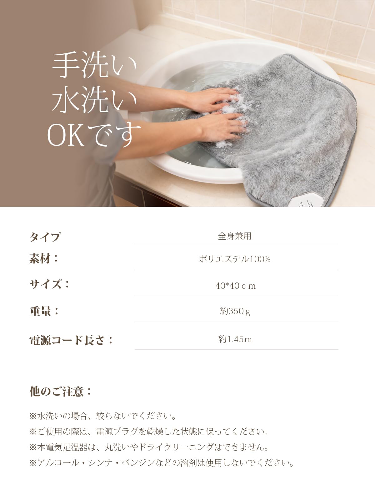 * 【他のご注意】①このホットマットは機械洗いサポートしません。②水洗いの場合、絞らないでください。③お手入れ前に必ず電源ブラグを抜いてください。④本電気足温器は、丸洗いやドライクリ一ニングはできません。⑤アルコ一ル・シンナ・ベンジンなどの溶剤は使用しないでください。⑥強モードでの長時間使用は、低温やけどなどで肌を傷つける恐れがあります。