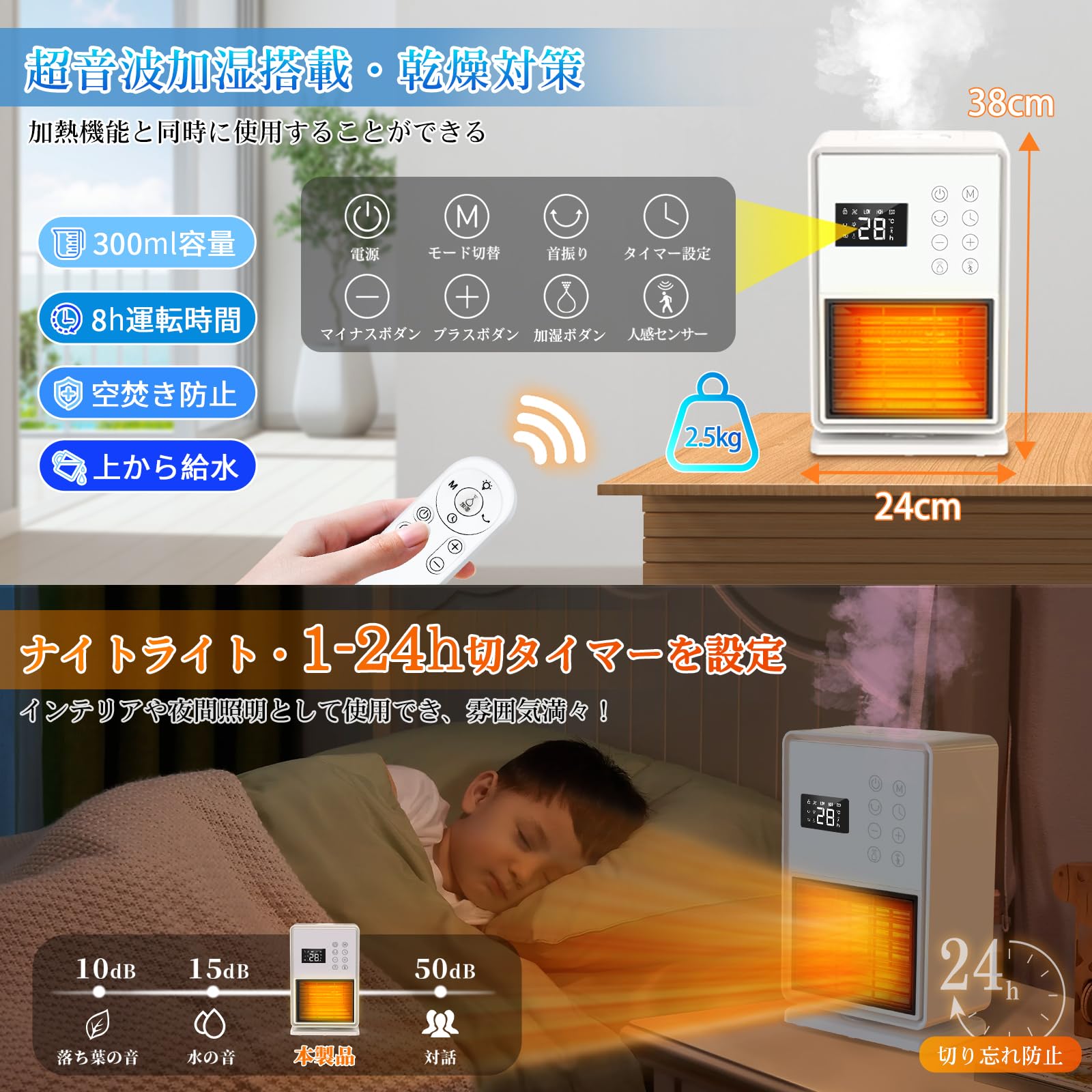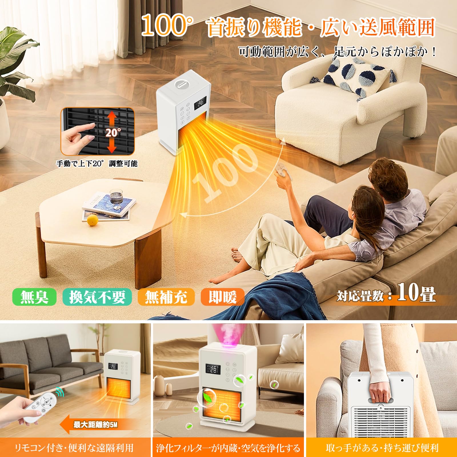 * 【2025冬向け独創モデル 暖房・加湿・空気清浄 3in1】このセラミックヒーターには、暖房機能に加えて加湿機能も備わっています。適量の水を水槽に注ぐだけで、加湿器のように霧が出ます。ヒーターが一日中熱風を吹いても、加湿機能によって一切の乾燥を感じることはありません。加湿ボタンを2秒間長押しすると、ムードライトが点灯します。温かく心地よい雰囲気を演出します。このセラミックヒーターには首振り機能も搭載されており、部屋全体を360度に温めることができます。さらに、ヒーターの風口には可動式の扇風機羽根があり、上下の風向を自在に調整することができます。風力を集中させて吹きたい場所に直接向けることができます。