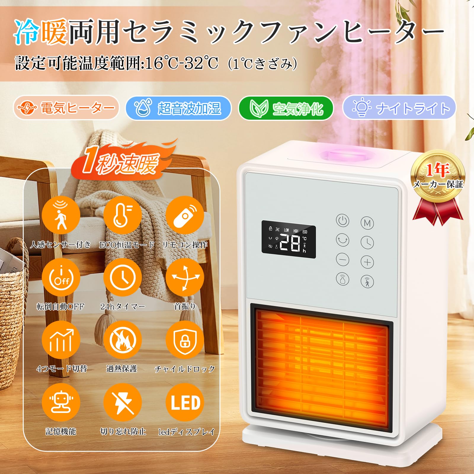 セラミックヒーター【2025冬新型 暖房・加湿・空気清浄】超音波加湿搭載 人感センサー付 ECO知能恒温 節電対策 LED大型ディスプレ カラーLEDライト 自動首振 電気ストーブ セラミックファンヒーターり電気ヒーター 1秒速暖 4段階切替 24時間タイマー機能 1200W/800W 転倒自動オフ 過熱保護 暖房器具 脱衣所 洗面所 台所 PSE認証済 (ホワイト)