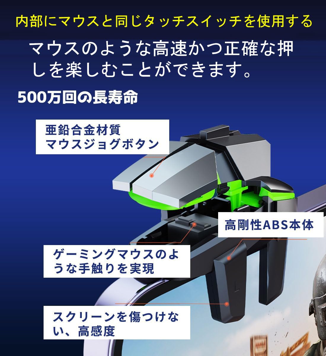 * 【メカニカルタッチ】耐久性と応答性に優れ、200万回以上のクリックが可能なように設計された4本のトリガーを備えたPUBG Mobile/荒野行動/Cyber Hunter モバイルコントローラー。適度な抵抗感のある高速なメカニカルキー、正確な作動、クリック音、触感のあるバンプフィードバックが特徴です。使いやすく、感度が高く、物理ボタンのフィードバックが得られます。このPUBG Mobile/荒野行動/Cyber Hunter モバイルゲームコントローラーを使用することで、左右の親指と人差し指を使って同時に移動、角度調整、狙い、射撃を行うことができます。