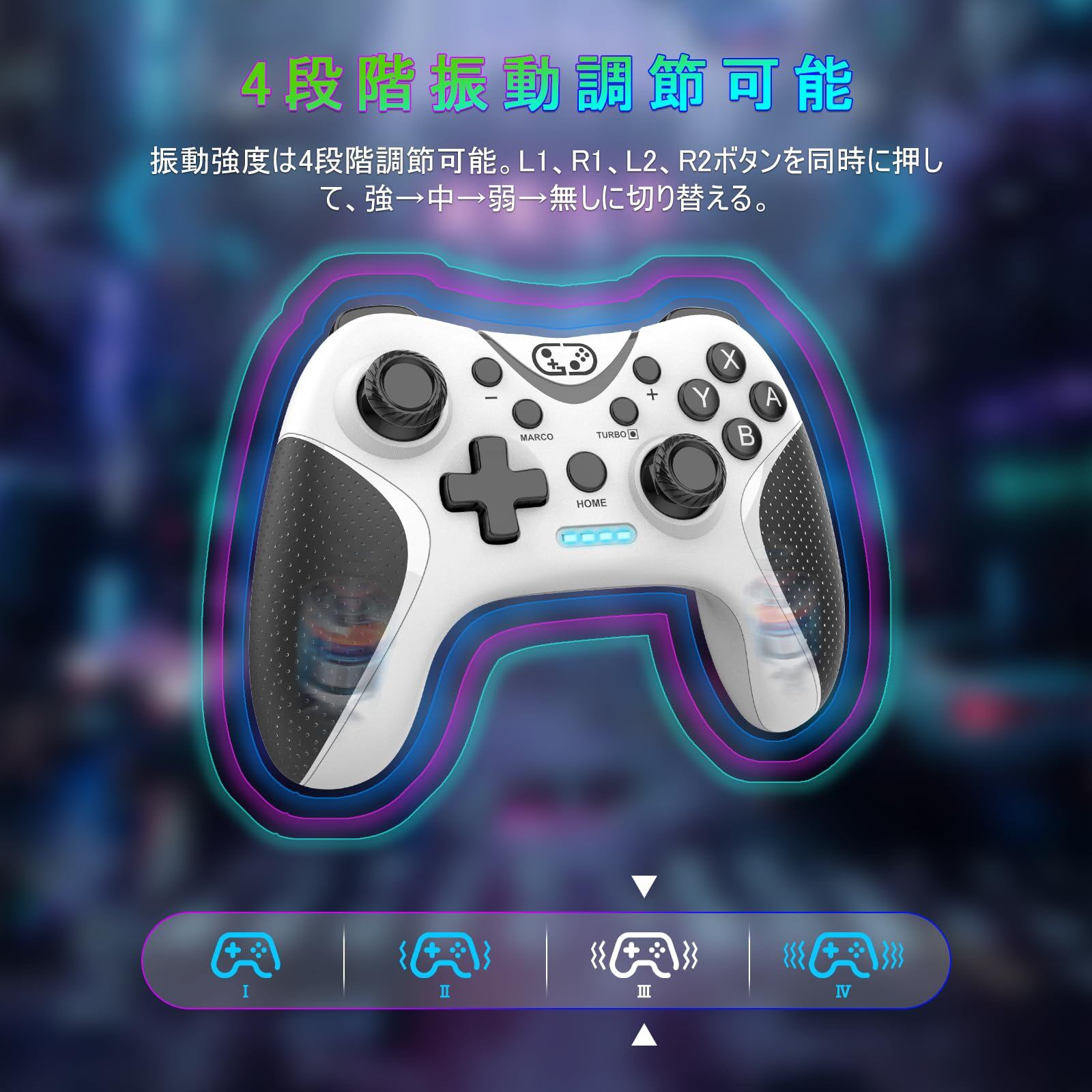 * 【2024年アップグレード版&高い交換性】本製品は2024年アップグレード版Switch用ワイヤレスコントローラーです。自動連射(連射ホールド)機能、2つの背面ボタン搭載、3段階Turbo連射速度、4段階HD振動、Bluetooth5.0接続、6軸ジャイロセンサー、マクロ機能など、純正プロコンにも搭載されていない多機能が搭載されます。さらに、本コントローラーは高い汎用性を持つ、Switch/Switch Lite/Switch有機ELモデルに対応、Android/iOS13.0+/ Windows7+に対応可能。Switch本体以外にも、パソコンやスマホ、タブレットなどの端末に接続可能です。Switchゲームにすべて対応でき、MFI認証のスマートフォンゲームにも対応可能、この一台で思い存分ゲーム三昧!