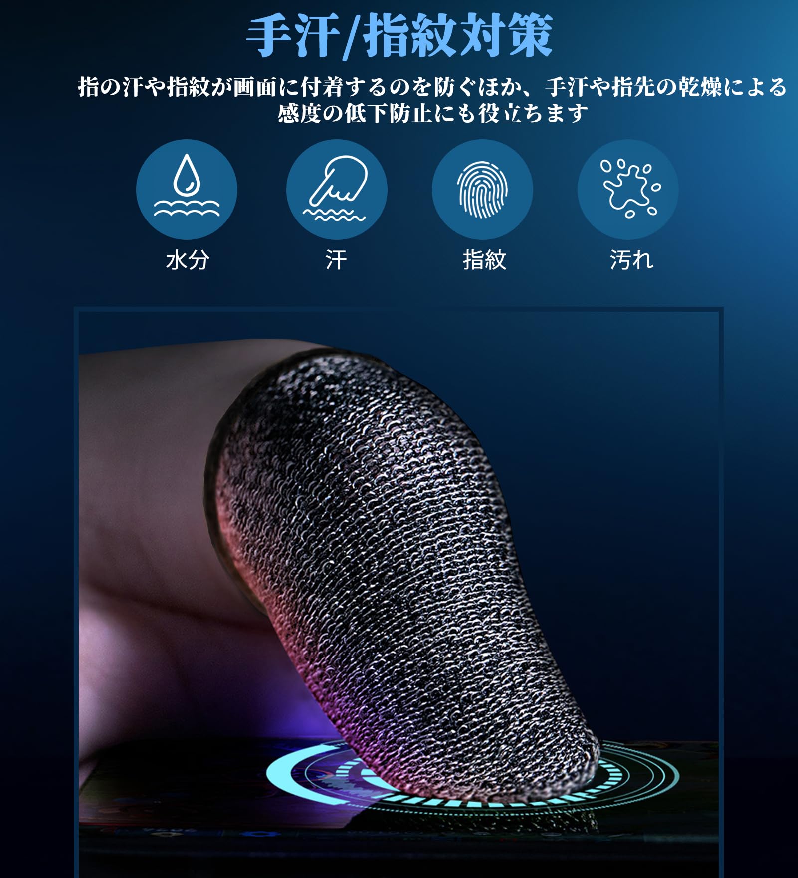 * 【スムーズな指の操作・手汗/指紋対策】最近では素早い操作が必要なFPSや時間制限のあるパズルゲームや音ゲーなどの操作性を高めたい声が増えています。本指サックは指の汗や指紋が画面に付着するのを防ぐほか、優れた吸収・拡散性能と共に速乾性能にも優れています。汗を素早く吸収して乾かし、指サックを快適な状態に保つことができます。また、タッチする部分は炭化繊維と銀繊維で編まれるため、画面上の動きは滑らかで引っ掛かりも全く無し、シューティングゲームや音ゲーなどのゲームをスムースに操作できました。