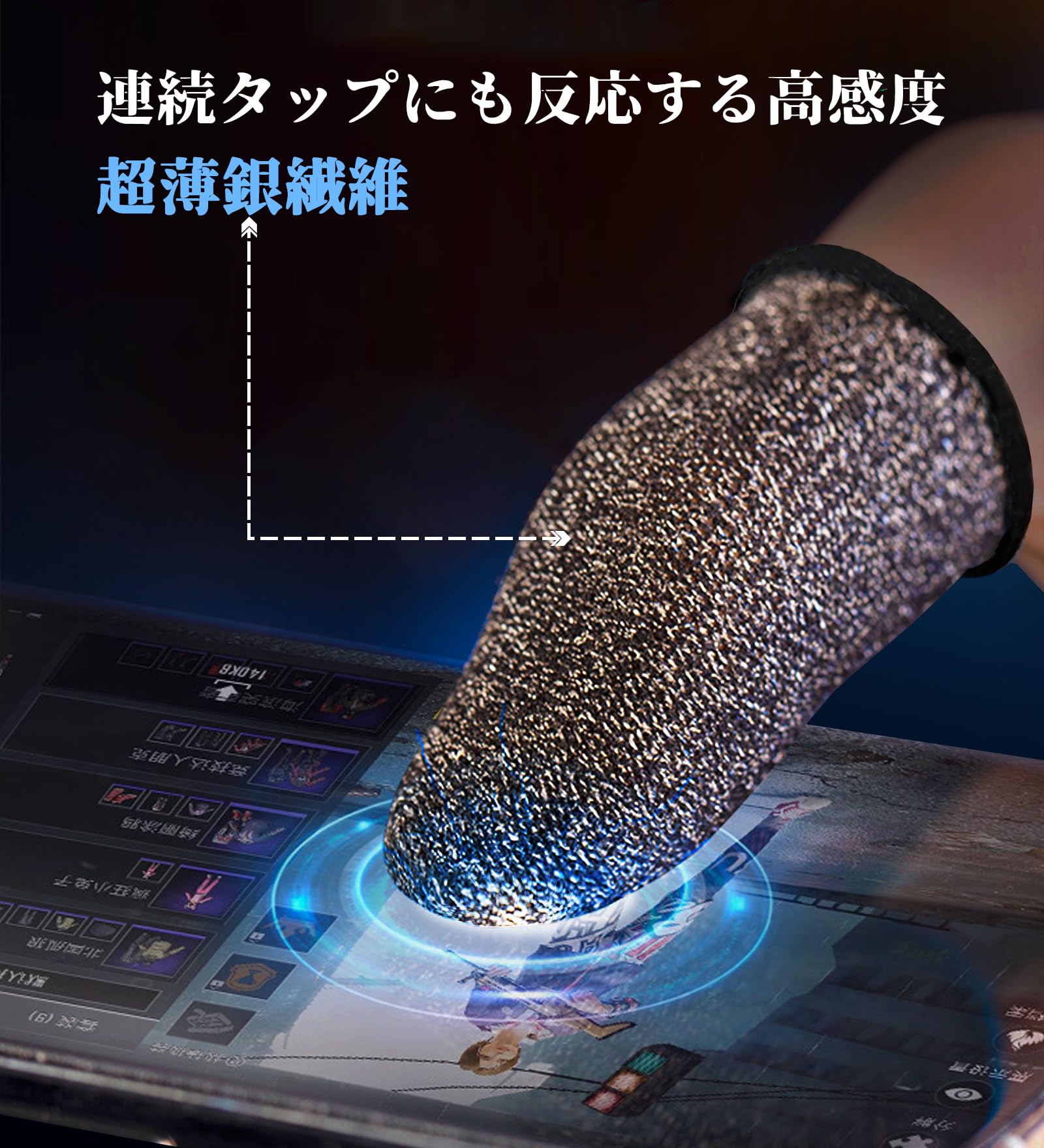 * 【超薄銀繊維・連続タップにも反応する高感度】ゲームでは、操作に対しての応答速度が遅いとキャラクターの動きが悪くなるため、撃ち負けることが多くなります。本指サックのタッチ部分はトップレベルの導電糸(炭化繊維)と銀繊維で編まれており、指先からの静電気をスマホに伝えやすく、連続タップにも反応する高感度を実現しました。思い通りの操作がしやすくなります。