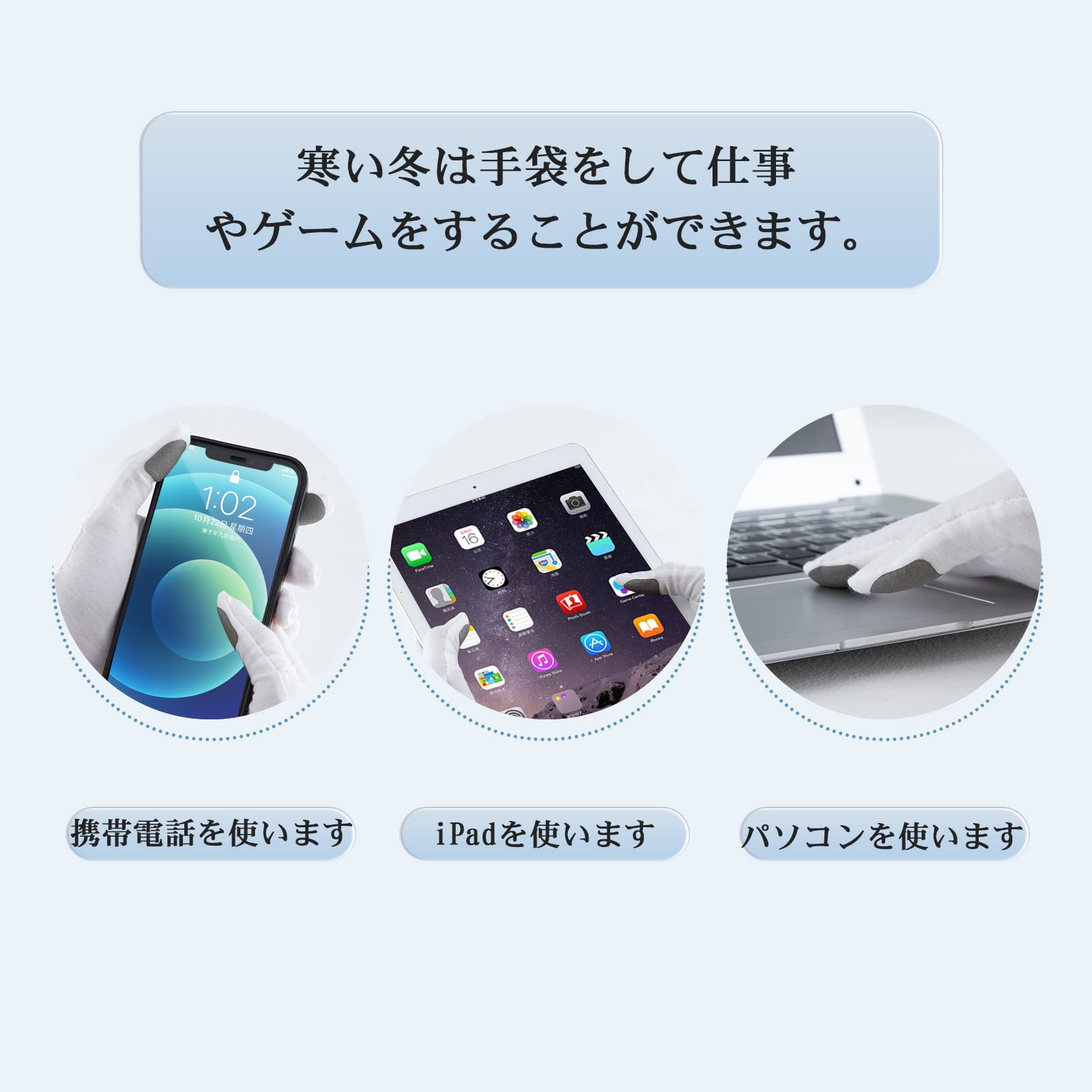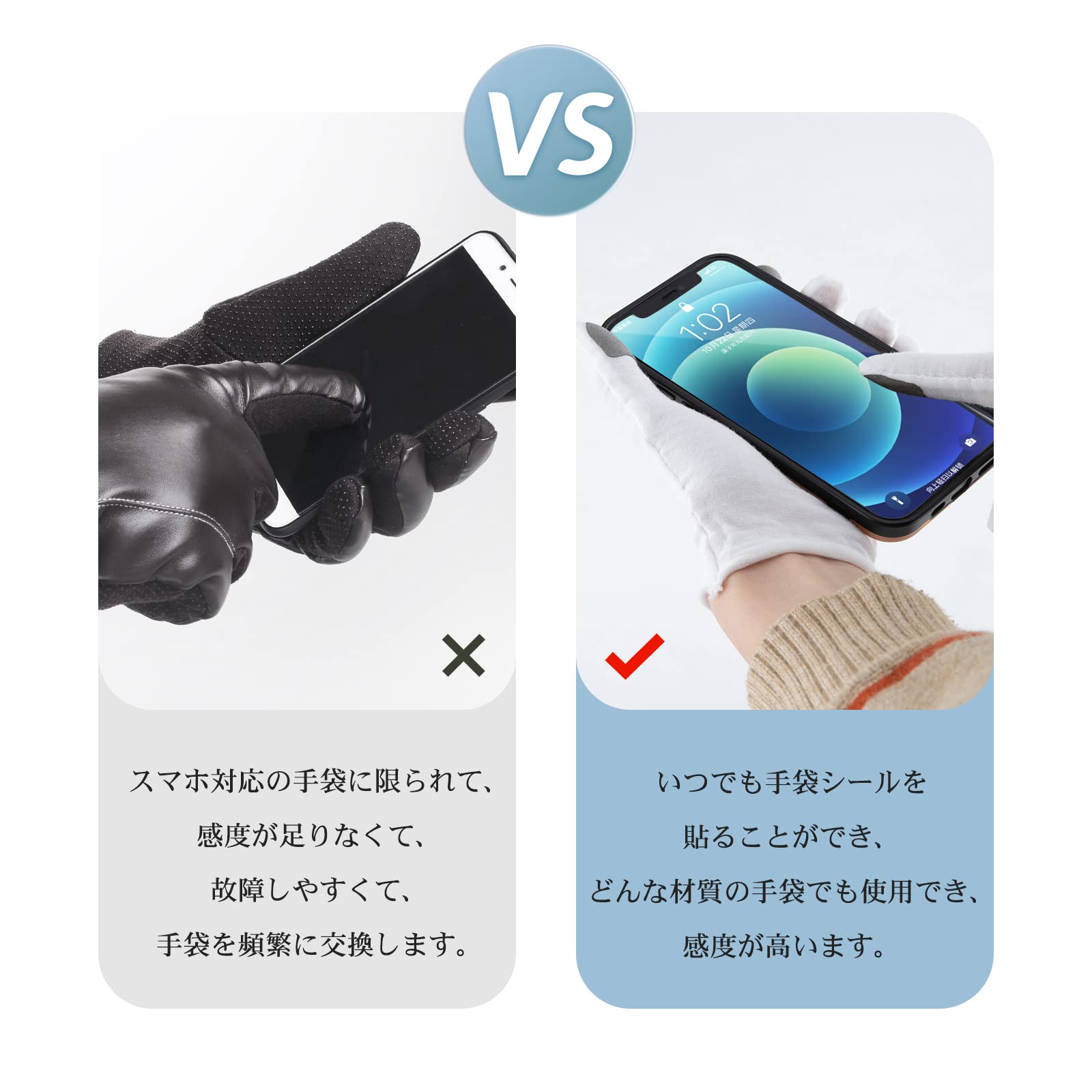 * 【使用方法】製品を指や手袋に平らに貼って、指の弧の辺に合っていることに注意して、指先の部分で画面をタッチしてください。