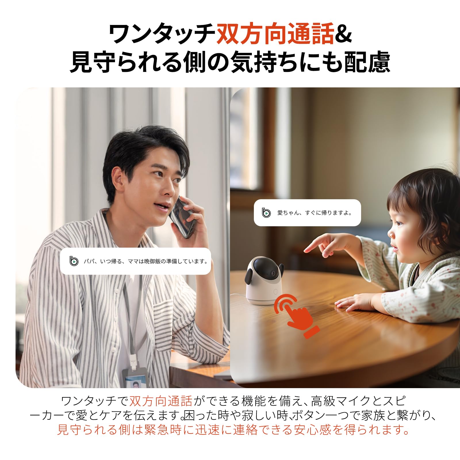 * 【ワンタッチ双方向通話&見守られる側の気持ちにも配慮】ワンタッチで双方向通話ができる機能を備え、高級マイクとスピーカーで愛とケアを伝えます。困った時や寂しい時、ボタン一つで家族と繋がり、見守られる側は緊急時に迅速に連絡できる安心感を得られます。物理ボタンひとつで双方向通話可能- 高齢者や子供でも直感的に使用可能 - 内蔵マイク/スピーカーでクリアで早めに音声伝達。【最適な使用シーン例】高齢者との会話留守番子供との会話料理中でも手を汚さず通話共働き家庭の夕方の連絡調整する、