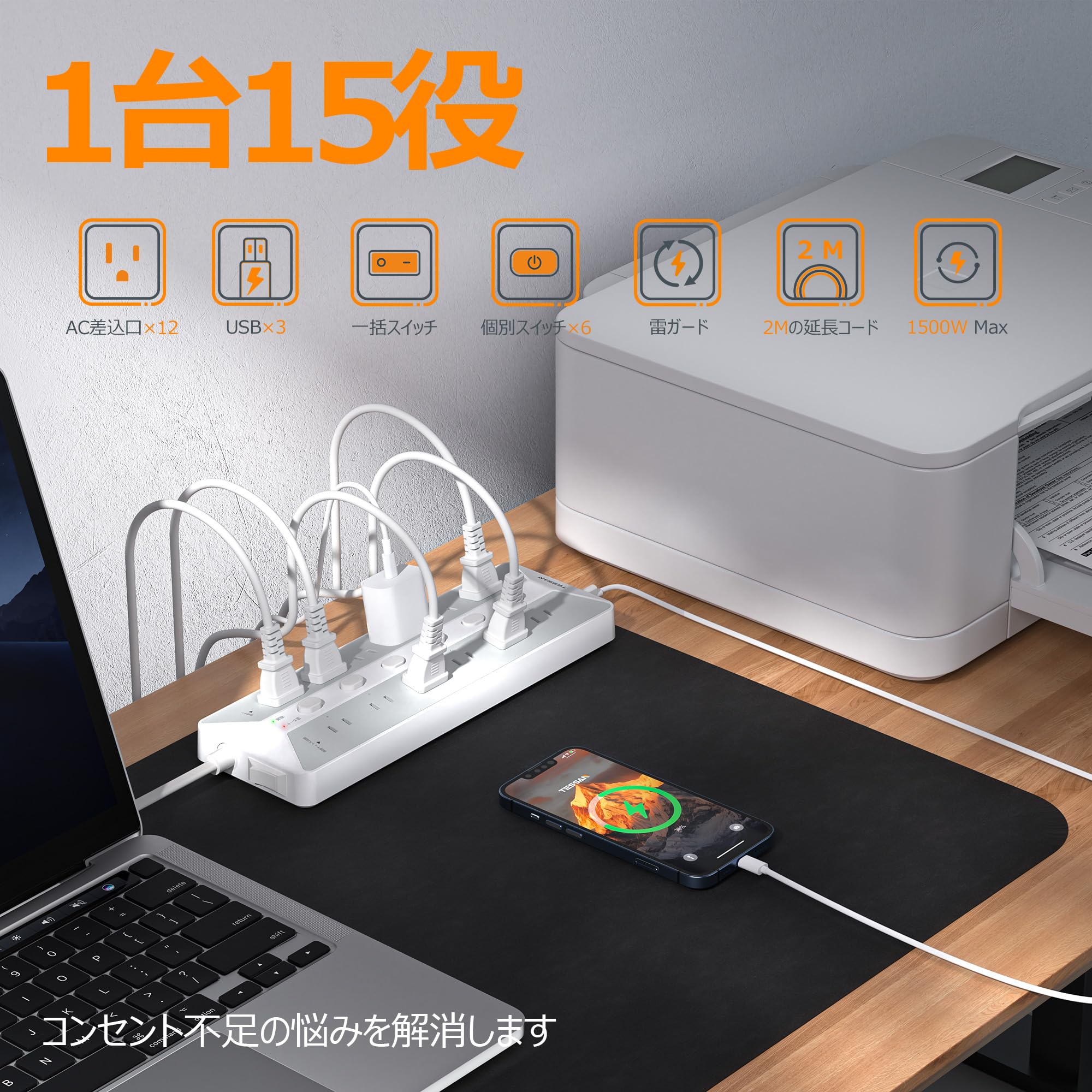 電源タップ スイッチ付き 延長コード 2m 薄型プラグ usb たこあしコンセント 拡張 TESSAN 12個AC口 3個USBポート テーブルタップ 壁掛け マルチ oa 蛸足コンセント たこあし配線 節電 省エネ 雷ガード