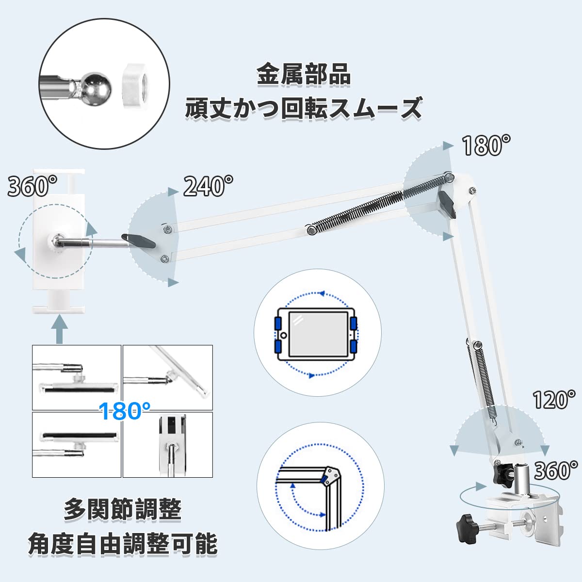 タブレット スタンド 【2024最新型 4つの関節を採用安定で揺れない】 タブレット アーム ipadスタンド ipad アーム 横/縱き ベッドサイド 寝ながら ベッド用 360回転 スマホ スタンド/ホルダー 4〜13.5インチ for iPhone&Android&iPad&Kindle &N-Switch、android surface 多機種対応日本語取扱説明書 ホワイト