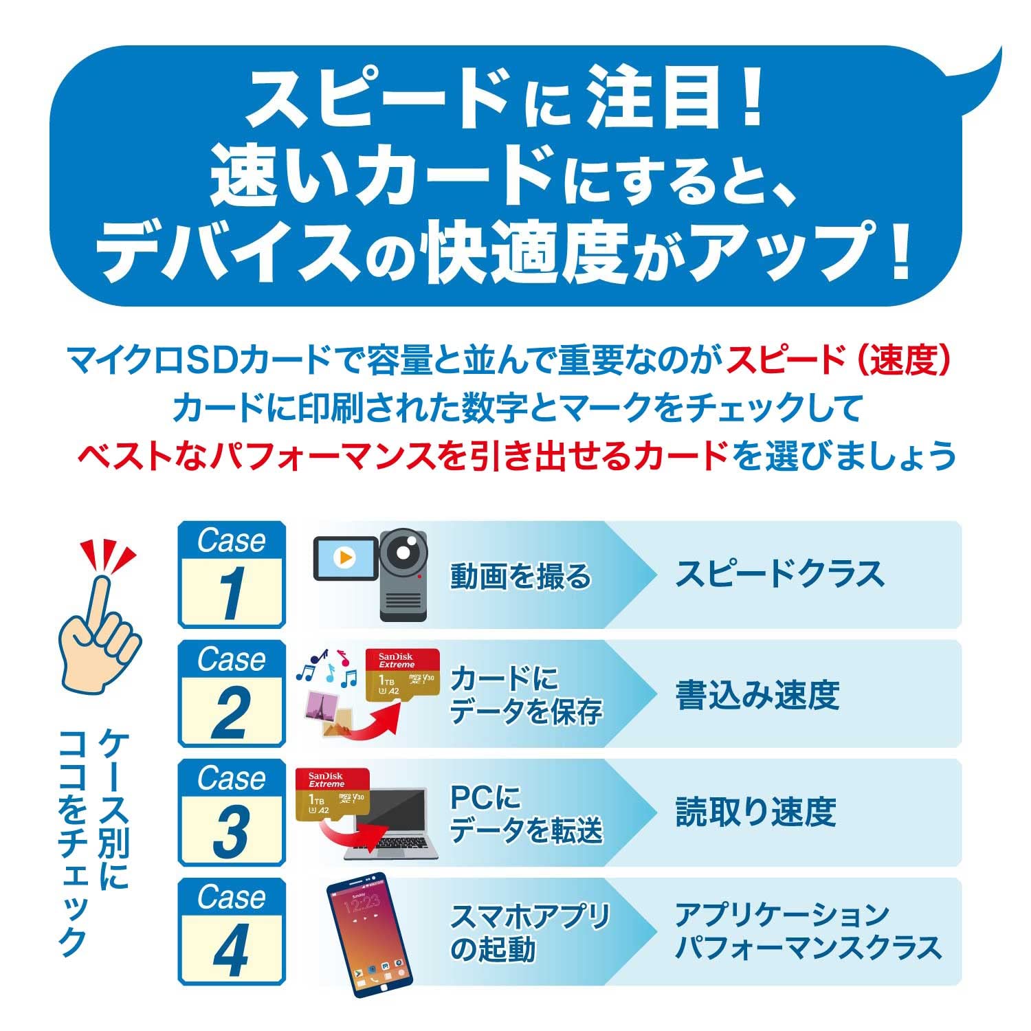 ■ サンディスク独自のテクノロジーを用いて最大読取り速度190MB/秒、最大書込み速度90MB/秒のデータ転送を実現 ビデオスピードクラス 30 (V30 )、UHSスピードクラス3( U3 )とCLASS10に対応し、4K動画やフルHD動画に対応