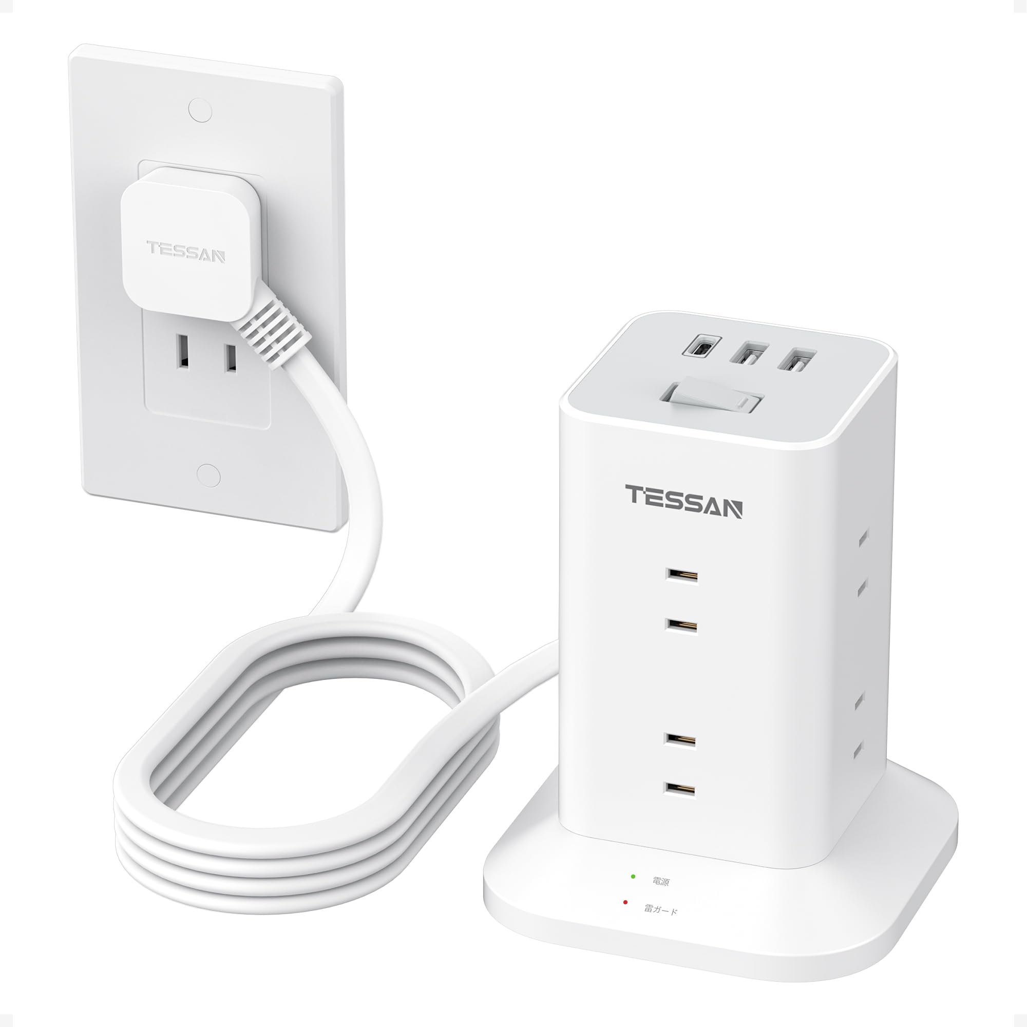 電源タップ タワー型 薄型プラグ 延長コード 3m 8個AC コンセント 1個USB-Cポート及び2個USB-Aポート TESSAN テーブルタップ たこあしコンセント タコ足配線 マルチ OA 雷ガード 一括スイッチ 省エネ mini型