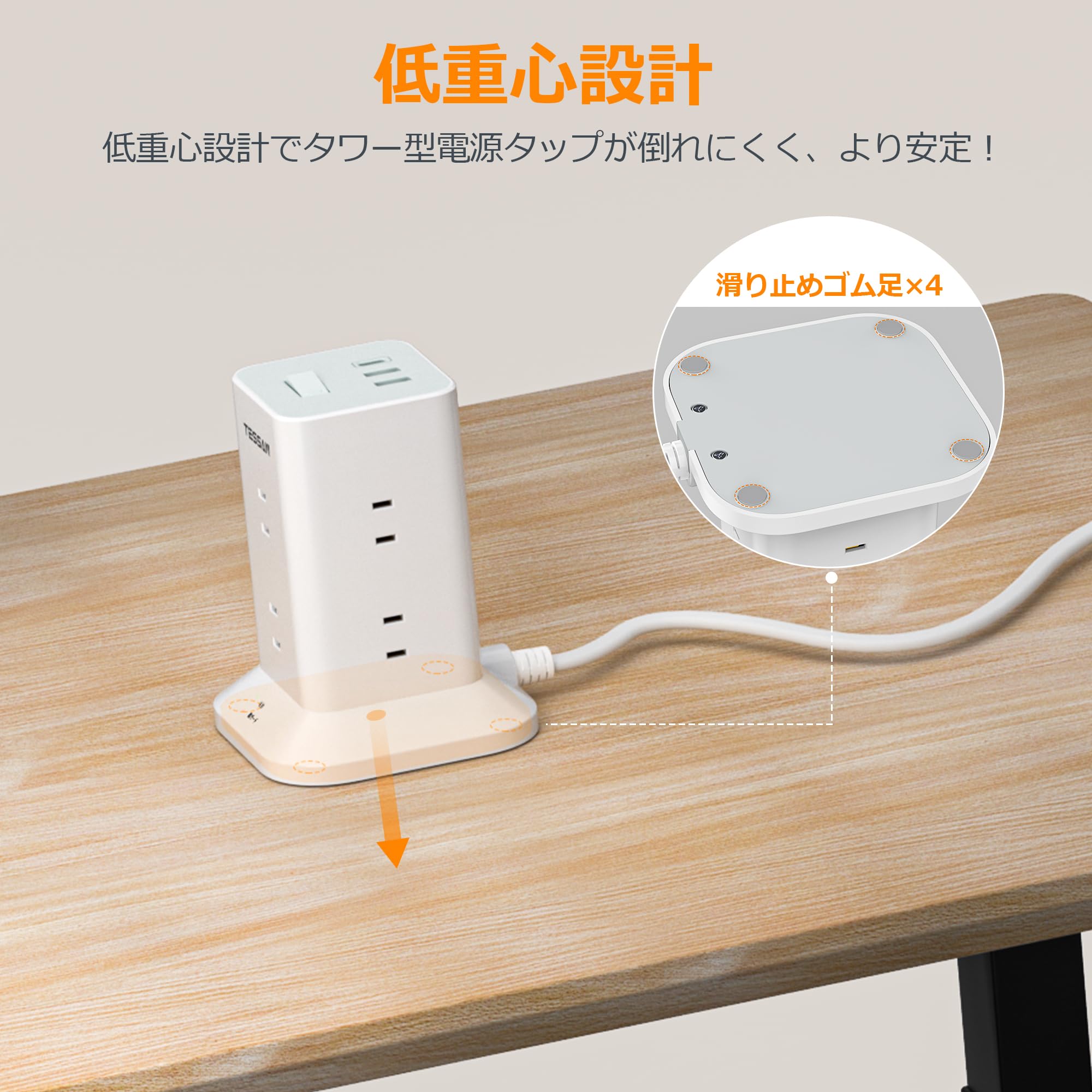 電源タップ タワー 延長コード 5m 8個AC コンセント 3USBポート付き 180°スイングプラグ TESSAN 延長コンセント 雷ガード マルチ 蛸足コンセント タコ足配線 テーブルタップ oa mini型