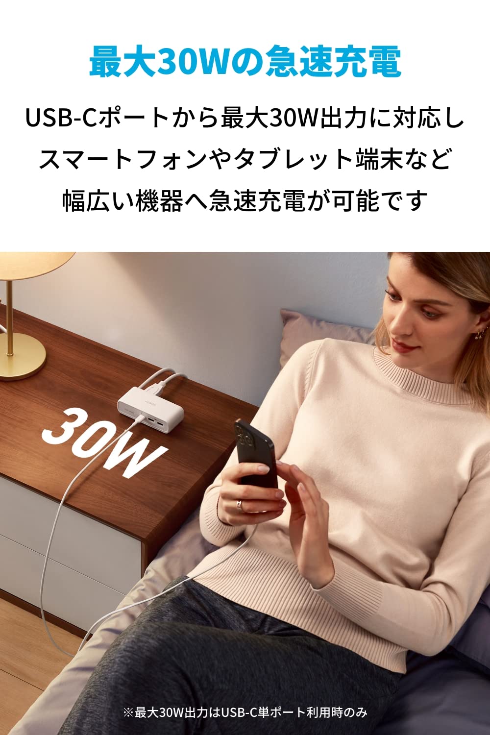 ■ 最大30Wの急速充電:USB-Cポートは最大30W出力に対応し、スマートフォンやタブレット端末など幅広い機器へ急速充電が可能です (※最大30W出力はUSB-C単ポート利用時のみ) 。