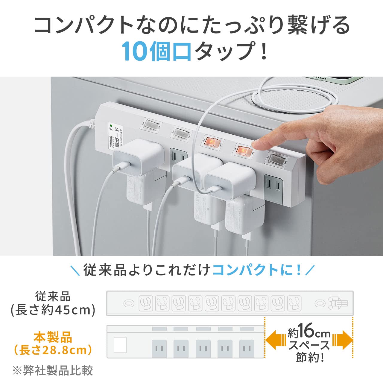 ■ 正面・側面にプラグを差せる設計で、従来の長い10個口タップよりコンパクトなボディを実現しました。