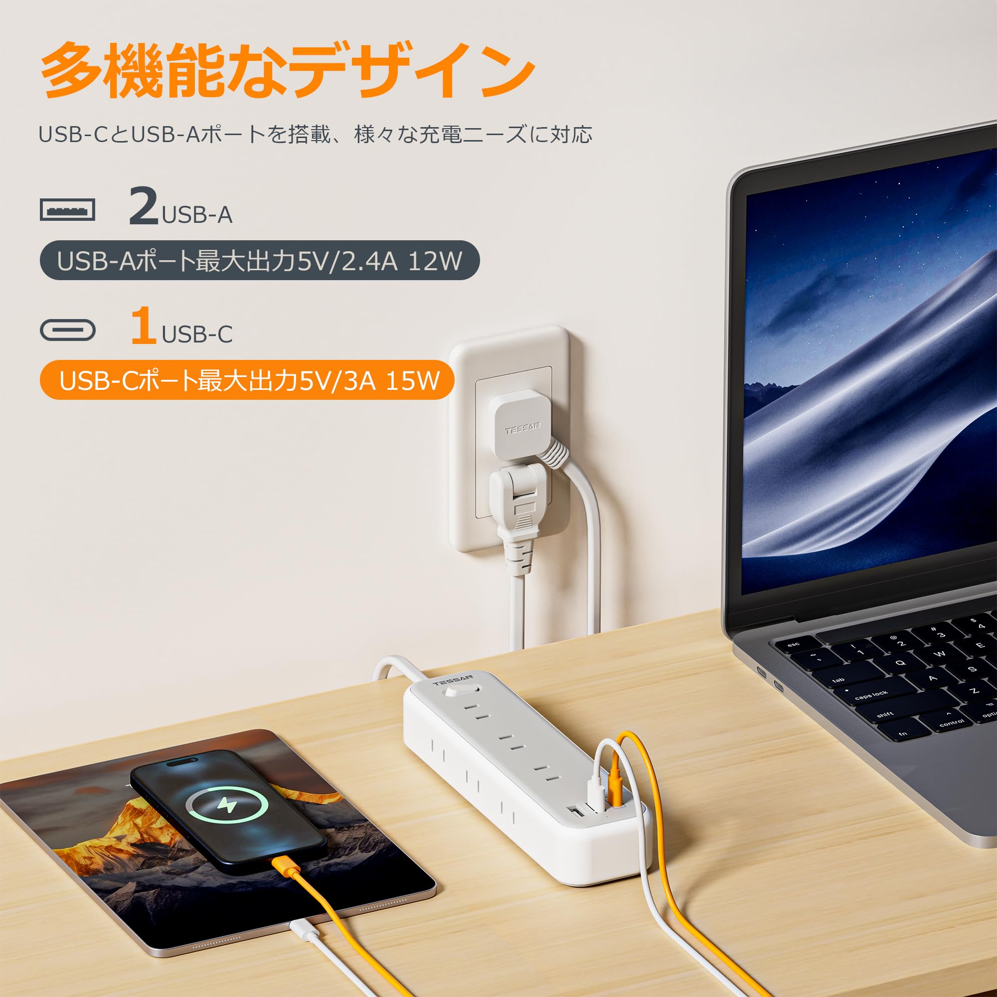 ACコンセントで複数の家電を接続しながら、USBポートでお使いのUSB機器を充電できます。