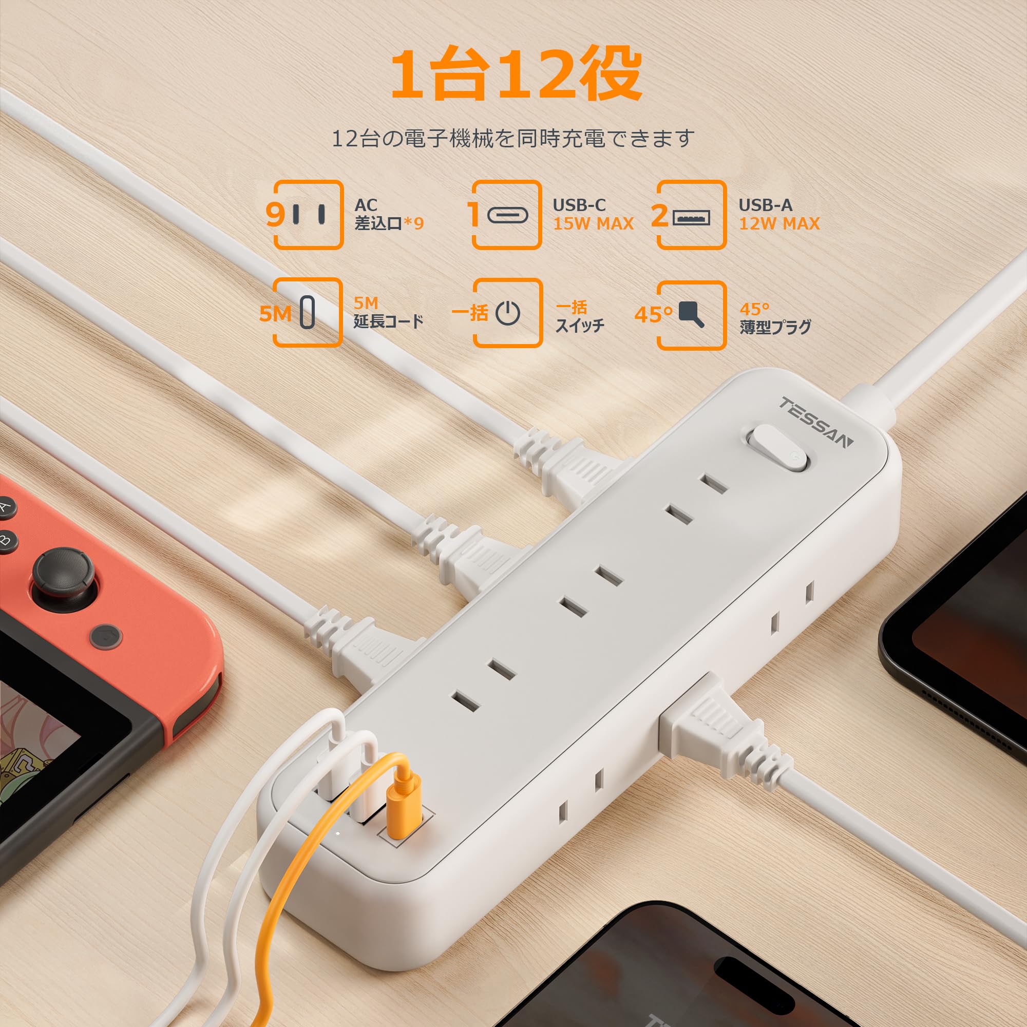 ■ 「一台12役·電源タップ」コンセント差込口9口に加えUSB-Cポート1つとUSB-Aポート2つを搭載します。