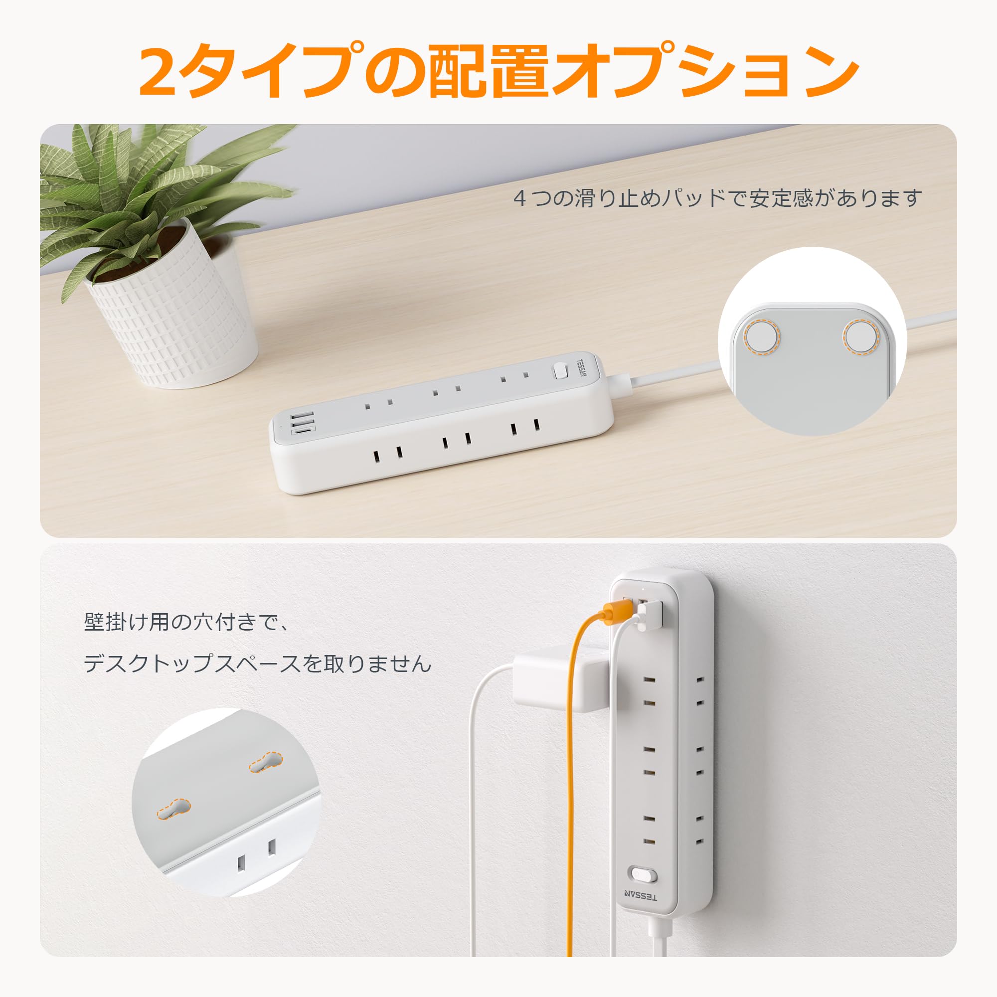 ■ 「壁掛け用·卓上に」:コンセントタップは壁等に仮固定できるフック穴付き、壁にかけてご利用できます。