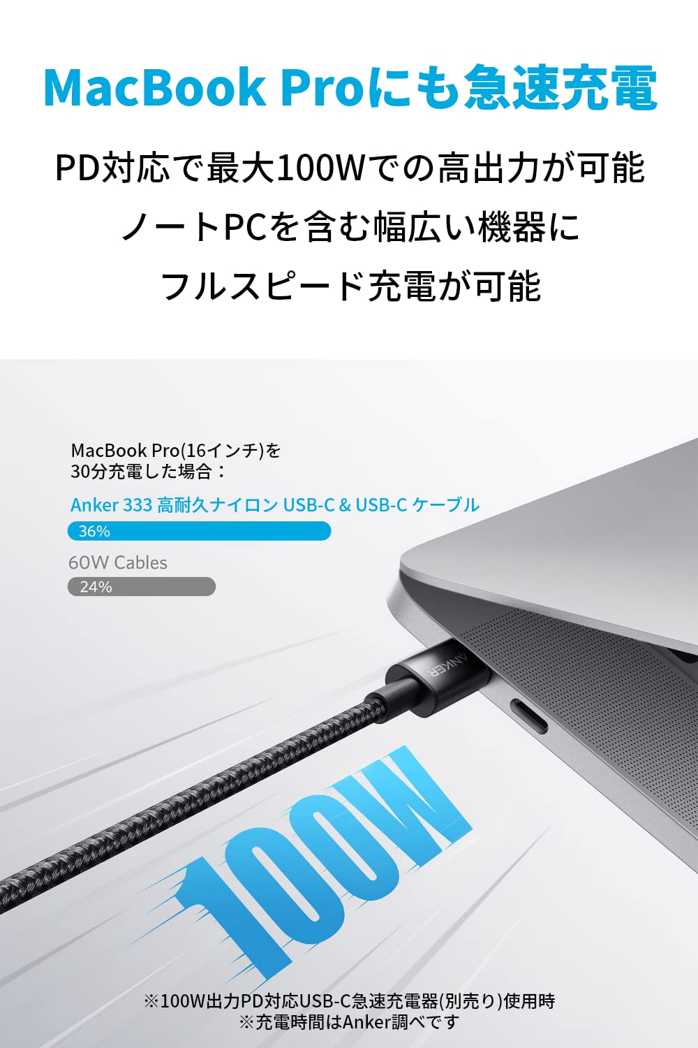 【3本セット】Anker 333 高耐久ナイロン USB-C & USB-C 2.0 100W ケーブル USB PD対応 MacBook Pro/Air iPad Pro iPad Air 4 Galaxy S20 Pixel LG 対応 (1.0m + 1.8m + 3.0m ブラック)