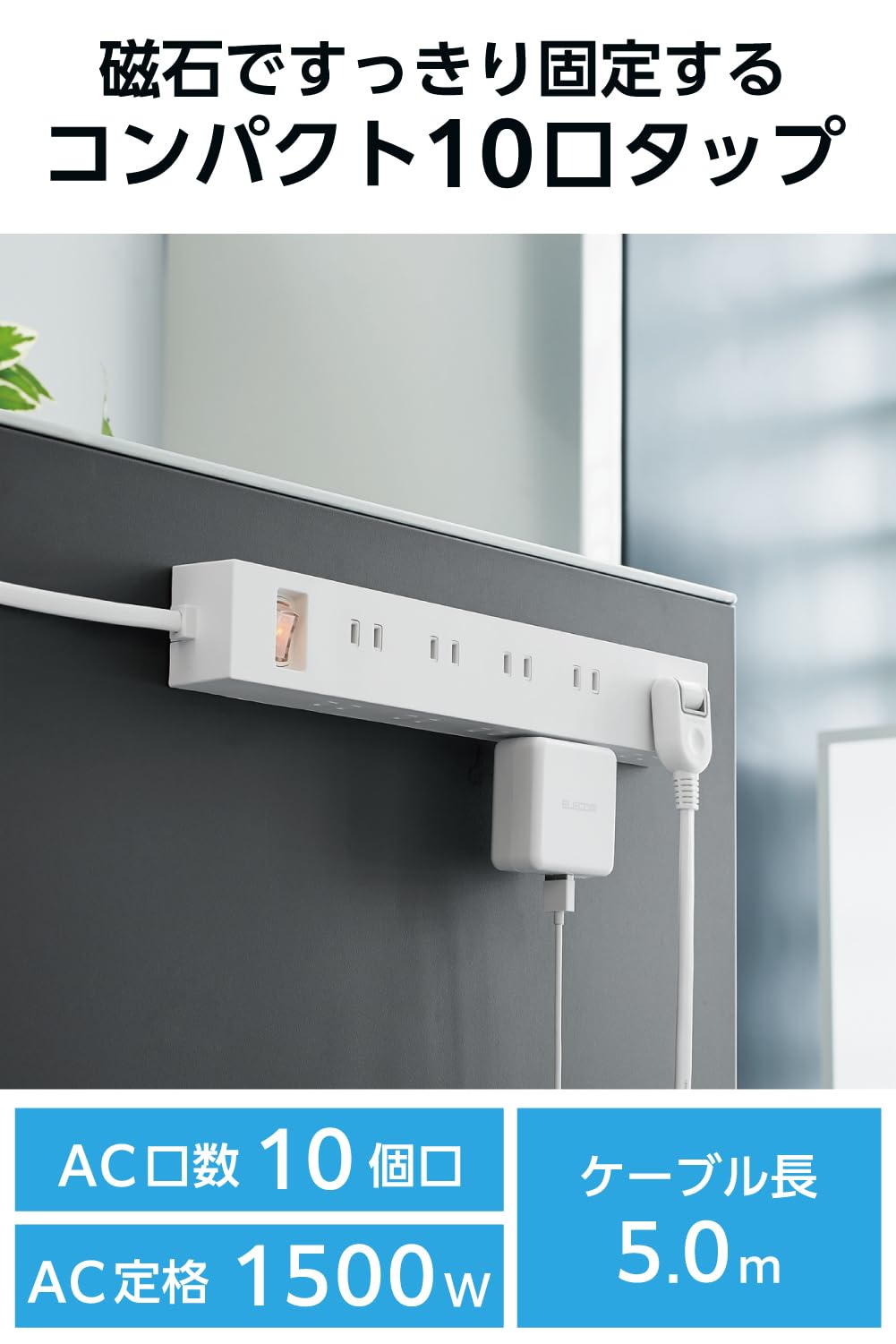 エレコム 電源タップ 10個口 差し込み口2面 5m マグネット ほこりシャッター付 スイングプラグ 雷ガード 一括スイッチ コンパクト ホワイト ECT-1550WH