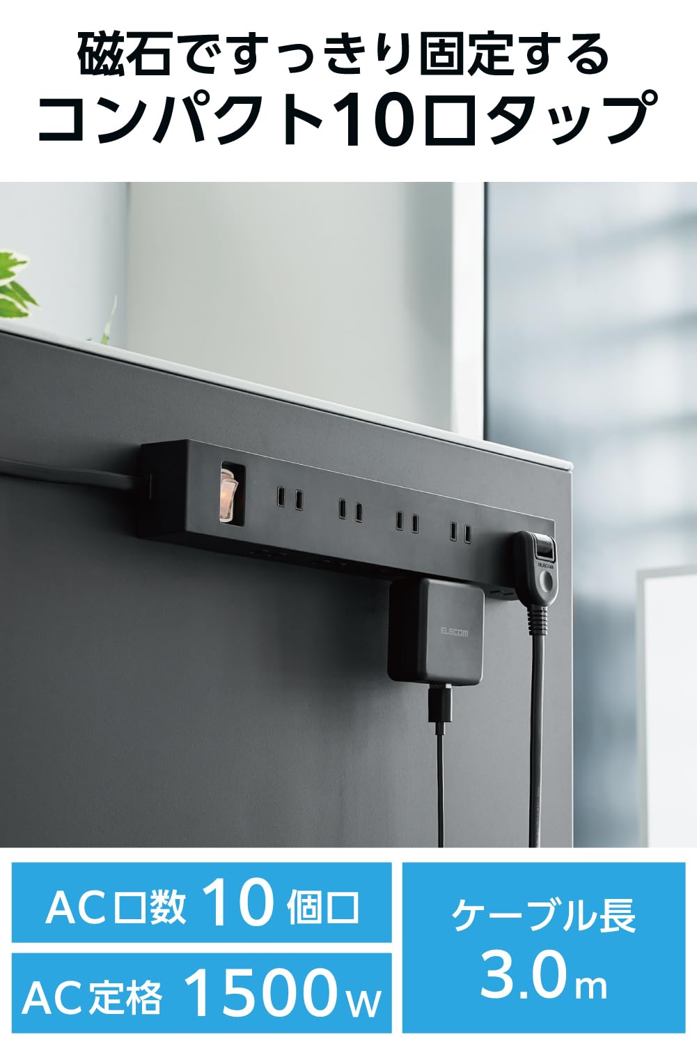 エレコム 電源タップ 10個口 差し込み口2面 3m マグネット ほこりシャッター付 スイングプラグ 雷ガード 一括スイッチ コンパクト ブラック ECT-1530BK