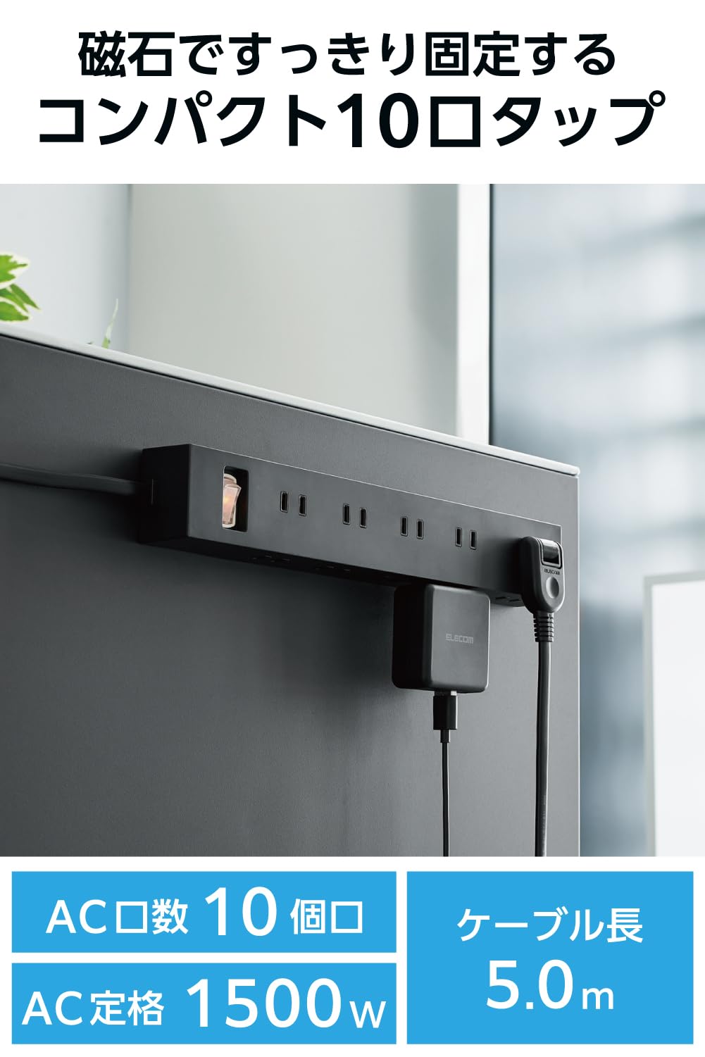 エレコム 電源タップ 10個口 差し込み口2面 5m マグネット ほこりシャッター付 スイングプラグ 雷ガード 一括スイッチ コンパクト ブラック ECT-1550BK