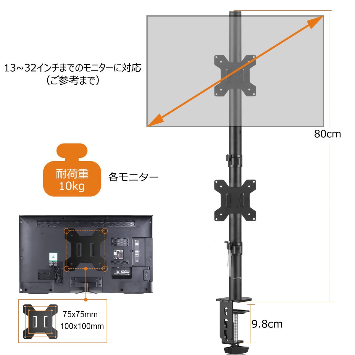 耐荷重は10KG(1台)で、VESA規格は75×75mm/100×100mmで、13~32インチPCモニターに対応します。