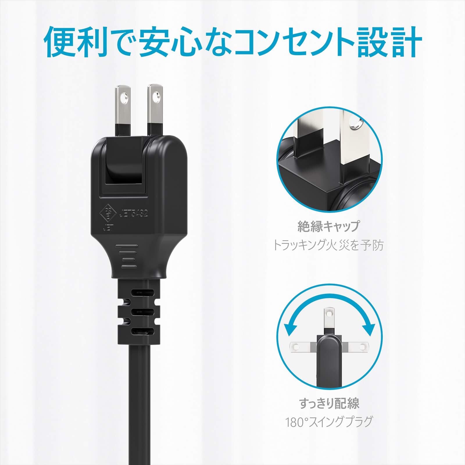 ■ 【使用者の利便性に配慮】電源タップのプラグが180°折りたたみ可能で、狭い場所でも使用できます。