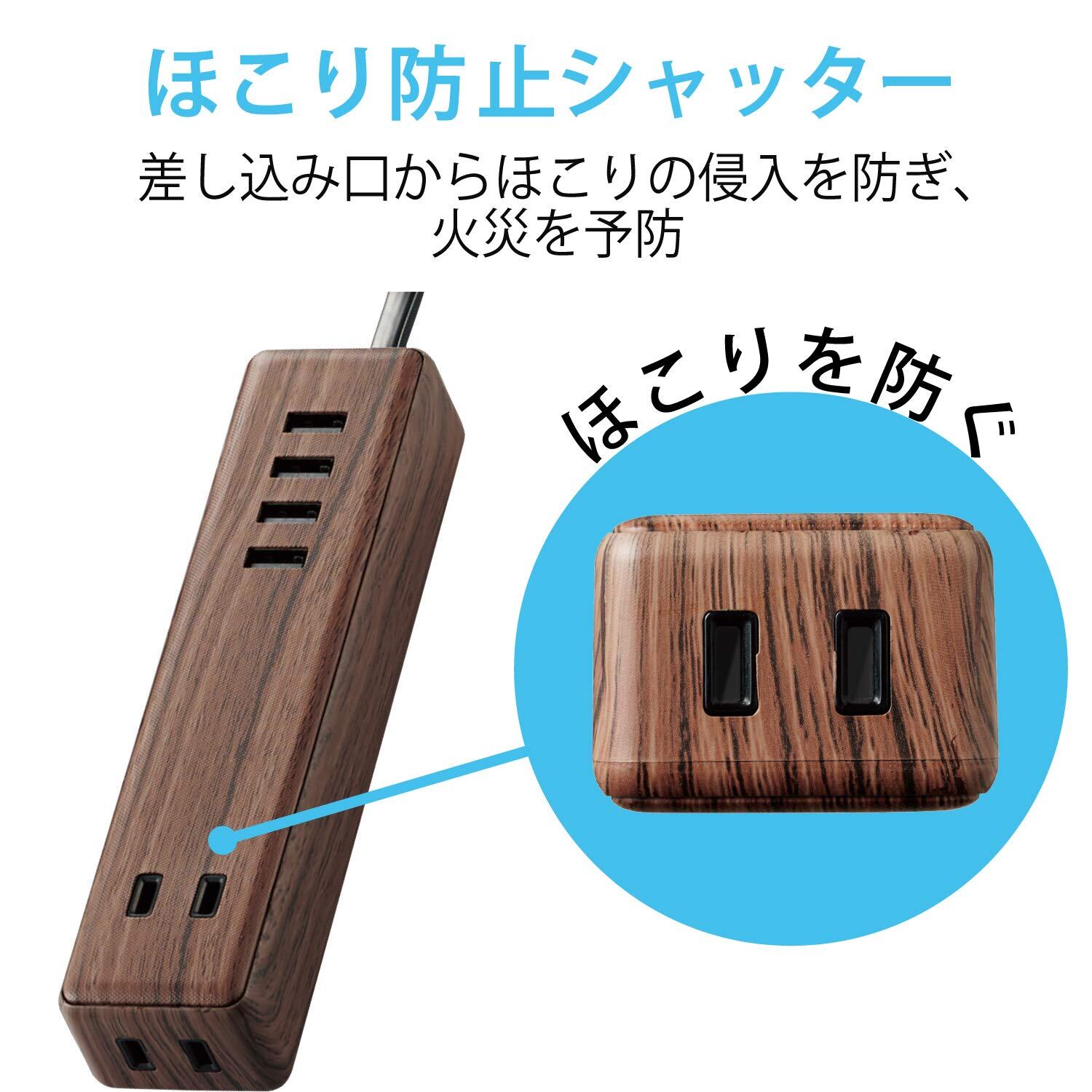エレコム 電源タップ USBタップ 12W (USBポート×4 コンセント×2) 1.5m ウォールナット ECT-0415W