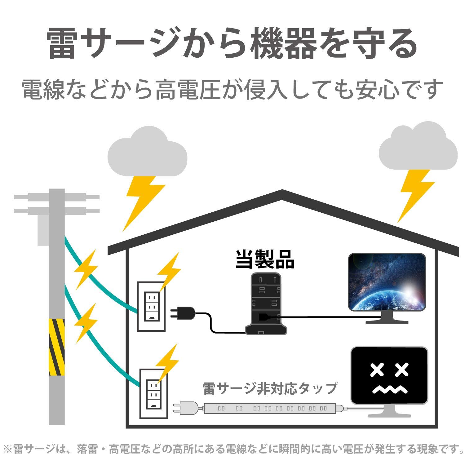 エレコム 電源タップ タワー型 延長コード [ 12個口 & USB×5ポート ] 固定パーツ付 雷ガード ほこりシャッター 2m ブラック ECT-0720BK