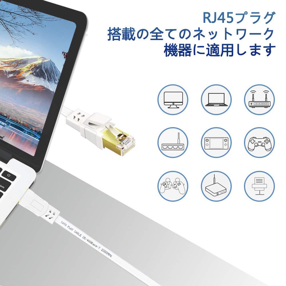 Ankuly CAT8 LANケーブル 10m カテゴリー8 ウルトラフラットケーブル 40Gbps/2000MHz ランケーブル やわらか FTPシールド イーサネットケーブル サーバー 企業様向け 業務用 屋外用 CAT8準拠 有線 (10m-ホワイト)