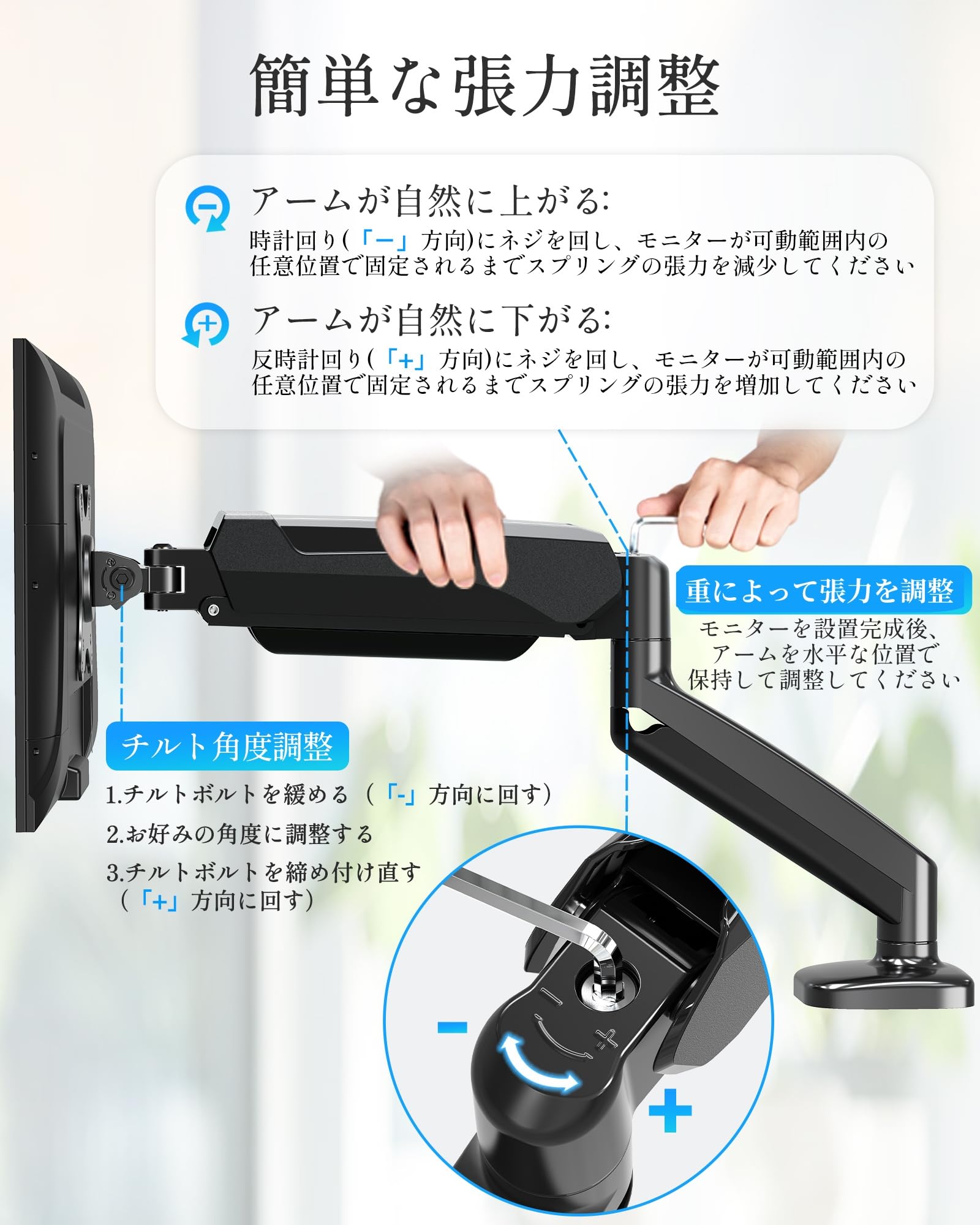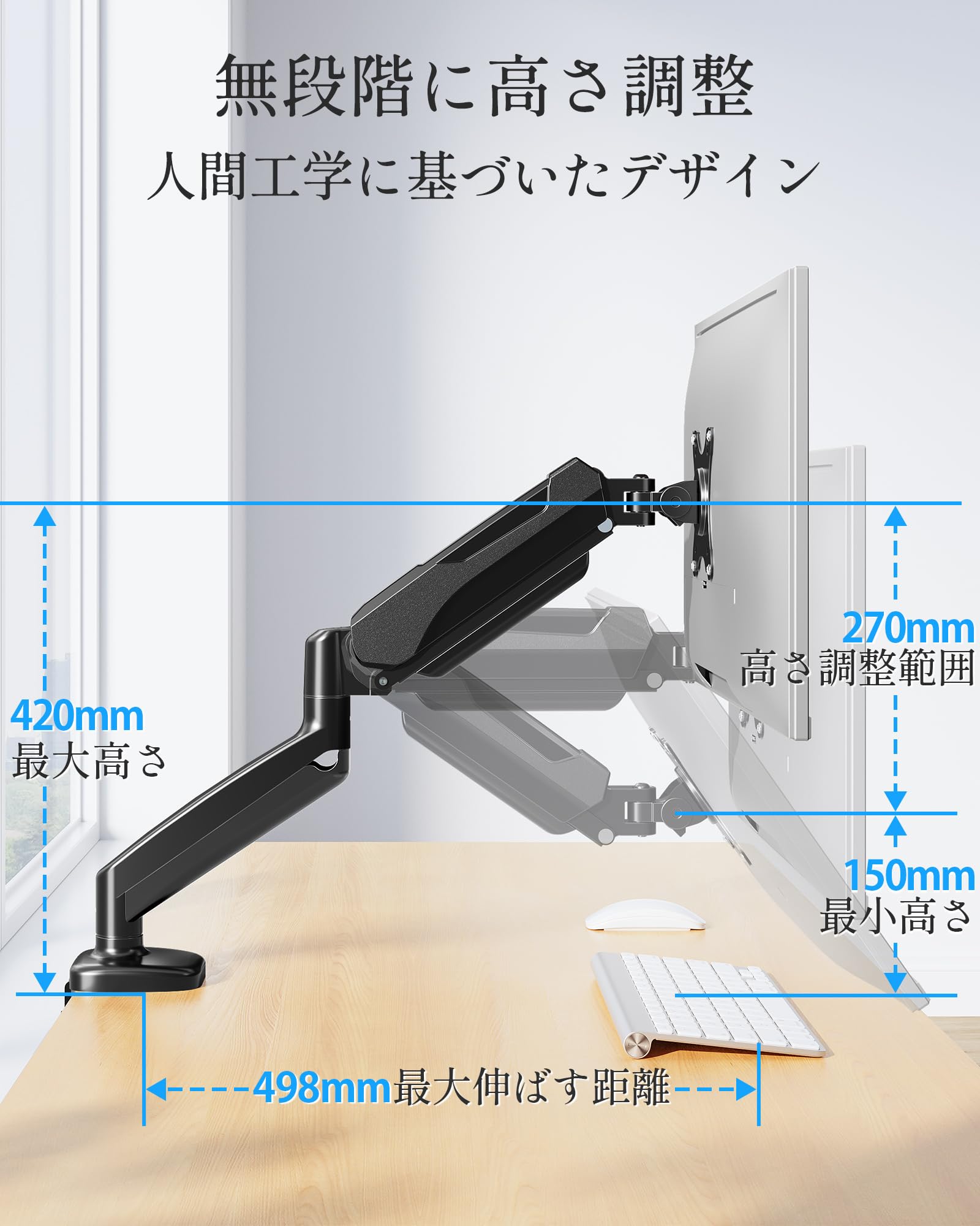 ■ 【シングルモニターアーム】軽い力で上下左右や前後に動かせ、液晶ディスプレイの位置を頻繁に変えたい人に向いています。