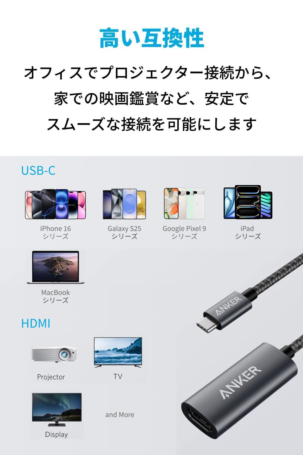 ■ 高画質出力:4K出力対応のHDMI変換アダプタにより、テレビやHDMI対応ディスプレイで最大4Kの解像度でコンテンツをお楽しみいただけます。