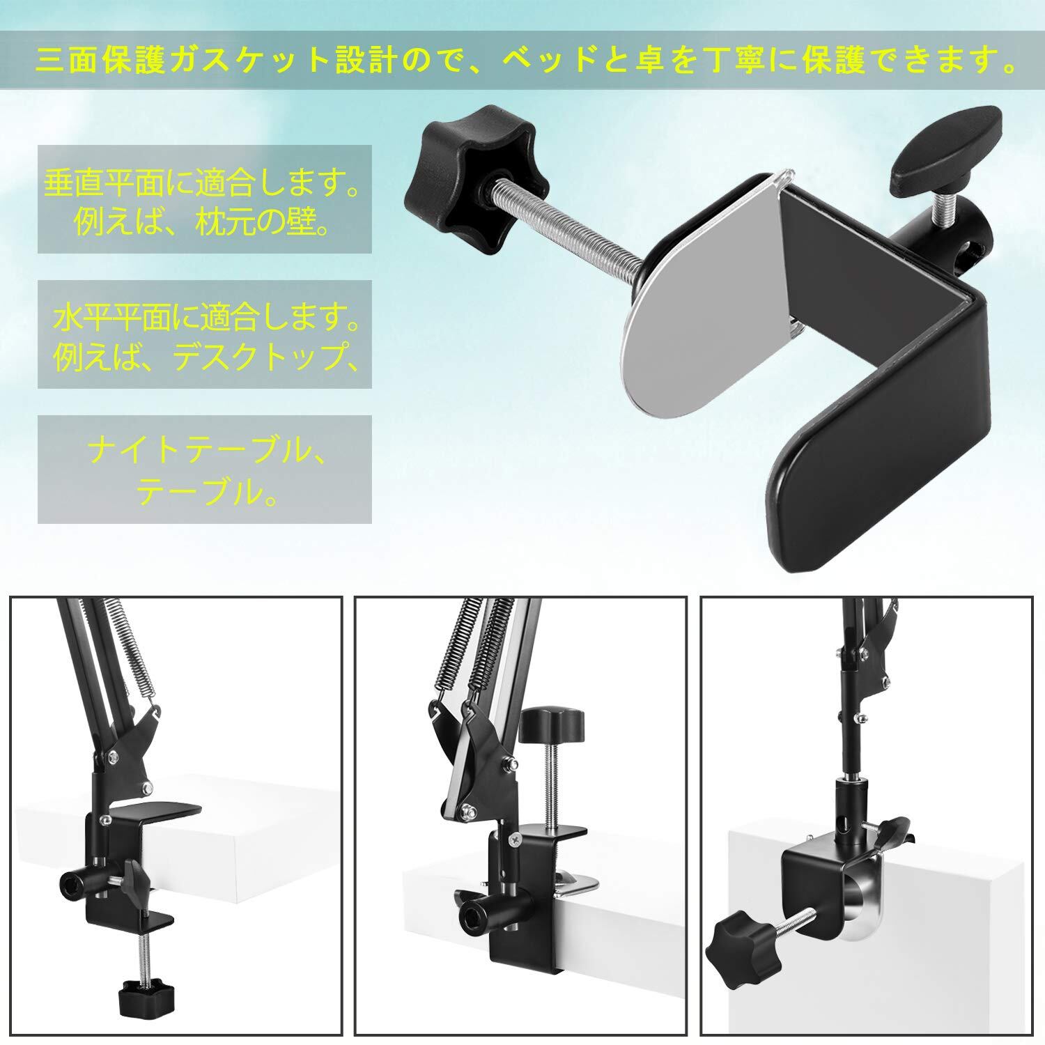 枕元の壁だけでなく、デスクトップにも取り付けることができます。